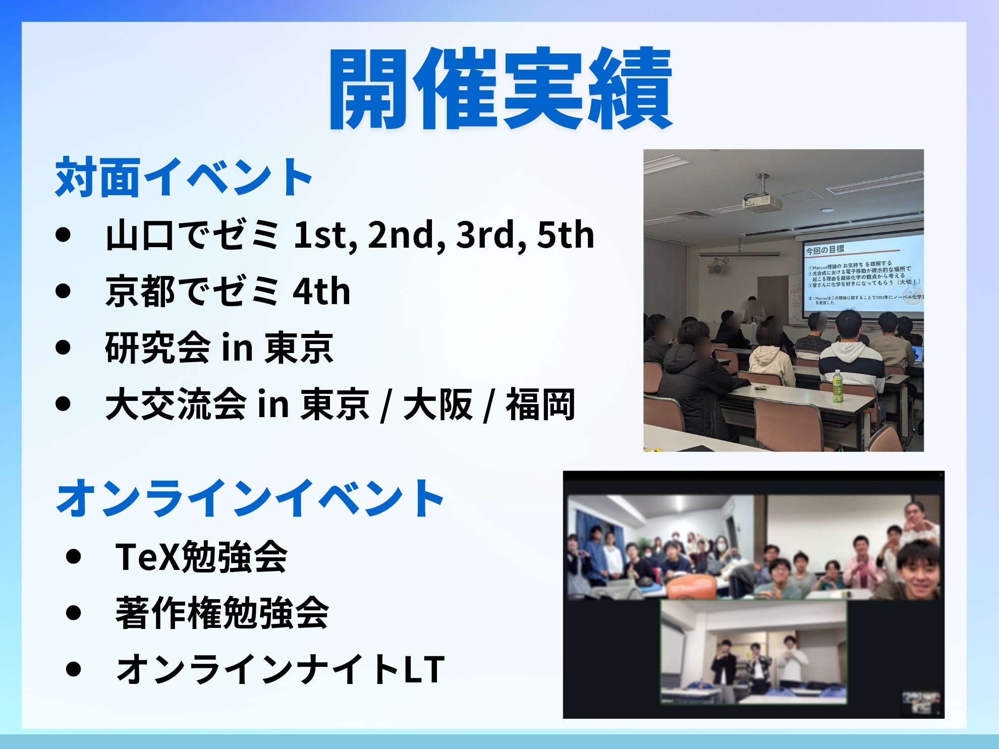 私たちはこれまでに5回の合宿を含む多数のイベントを開催し、全国40以上の大学・高専から延べ300名を超える学生に参加していただきました。