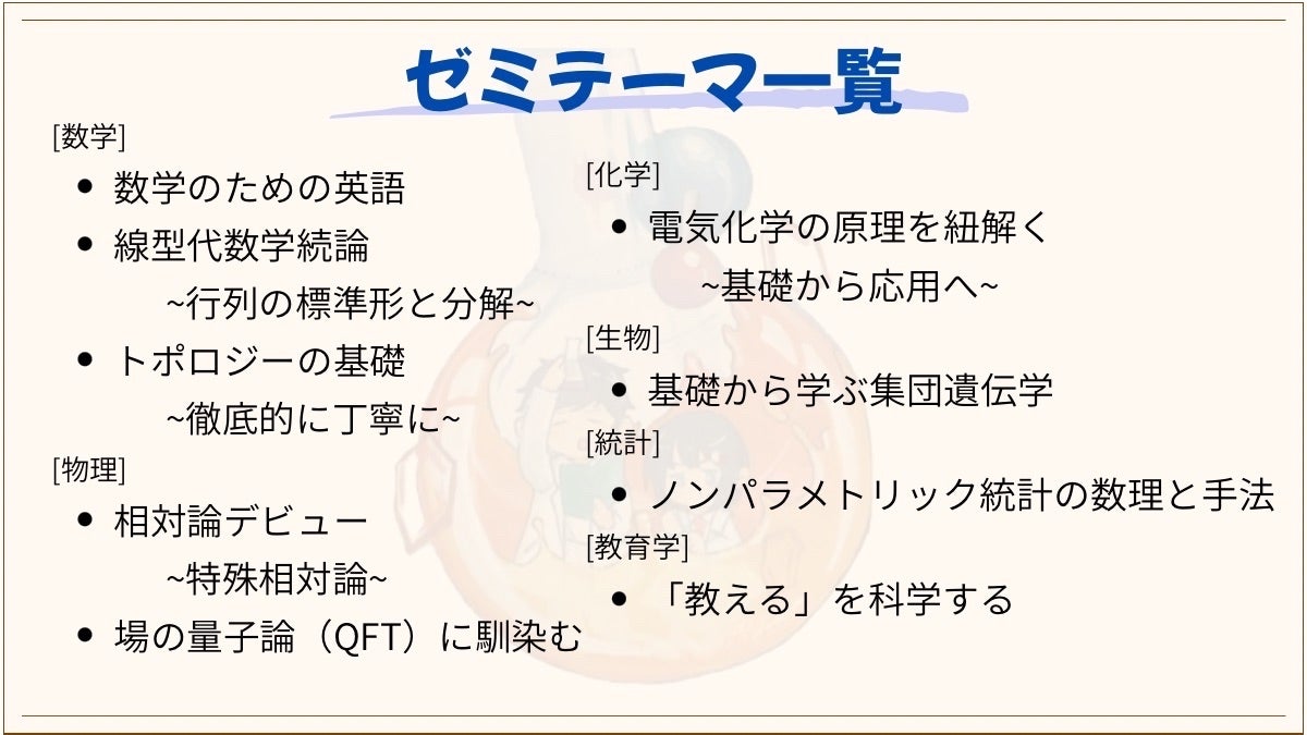 今回は6分野9テーマの自主ゼミを用意しました。いずれのテーマも庶務の学生が内容,使用する本,勉強の進め方を考えてくれています。