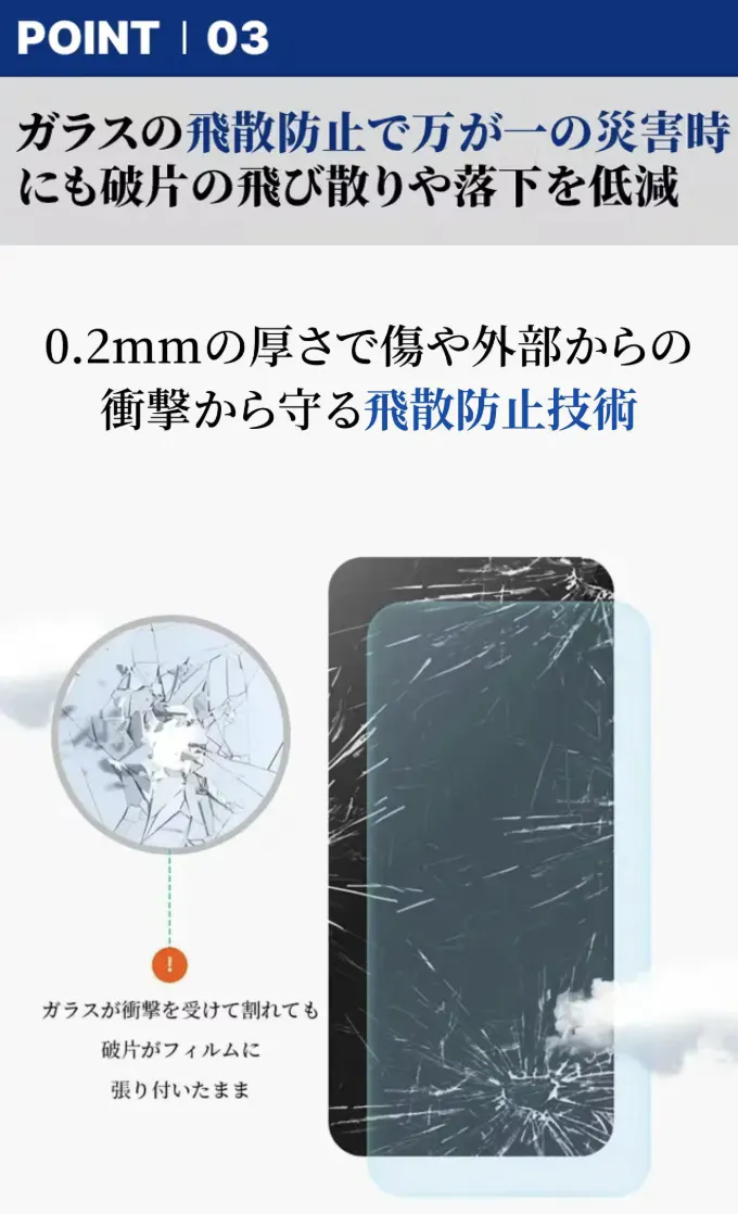 A: ガラス割れはガラスの種類(強化ガラス・複層ガラスなど)、厚み、端部の仕上げ状態、設置された環境、また「日向と日陰が混在している部分での温度差」など、複数の条件が重なった場合に限り、非常にまれに発生する現象です。当社が提供するキャプテンDAMAGAシートは、これらのリスク要因を考慮して設計されており、非粘着タイプの構造によりガラスの動きにも柔軟に対応するため、シートの貼付によってガラスに過度なストレスがかかることがなく、これまでに熱割れなどの破損事例は一件も報告されておりません。