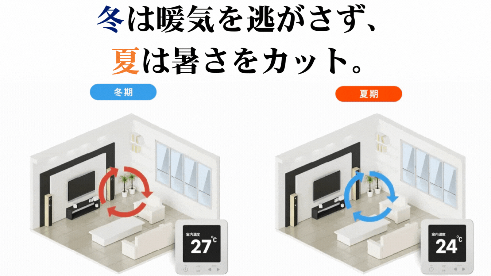 冬は、窓からの熱損失を抑制し、室内の暖気を保持することで、暖房効率が向上。