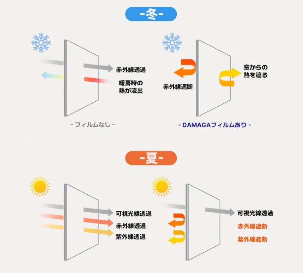 DAMAGAシートは、外の冷気を室内に伝えにくくし、室温をしっかりキープする断熱フィルムです。