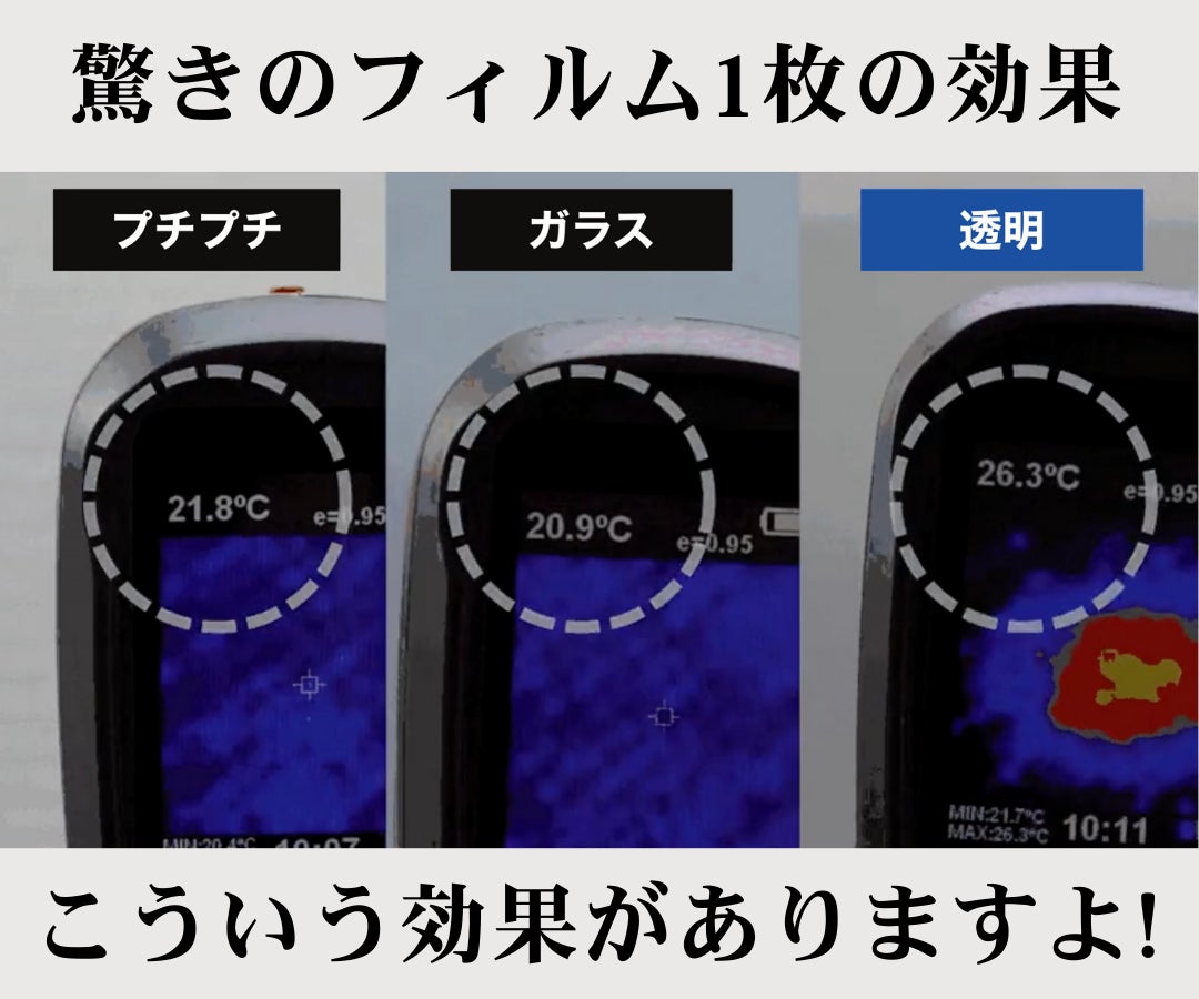 こちらの比較画像をご覧ください。何も対策をしていないガラス窓と本製品を施工した窓では、表面温度に明確な差が出ています。