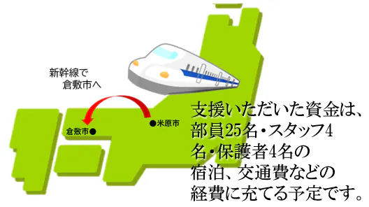 ・全国大会出場経費として部員25名、スタッフ4名、保護者4名の交通費、宿泊費等に充当させていただきます。