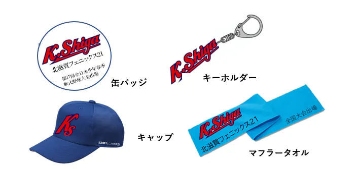 大会記念のチームロゴを使った缶バッジ、キーホルダー、マフラータオル、キャップをオリジナルで作成します!
