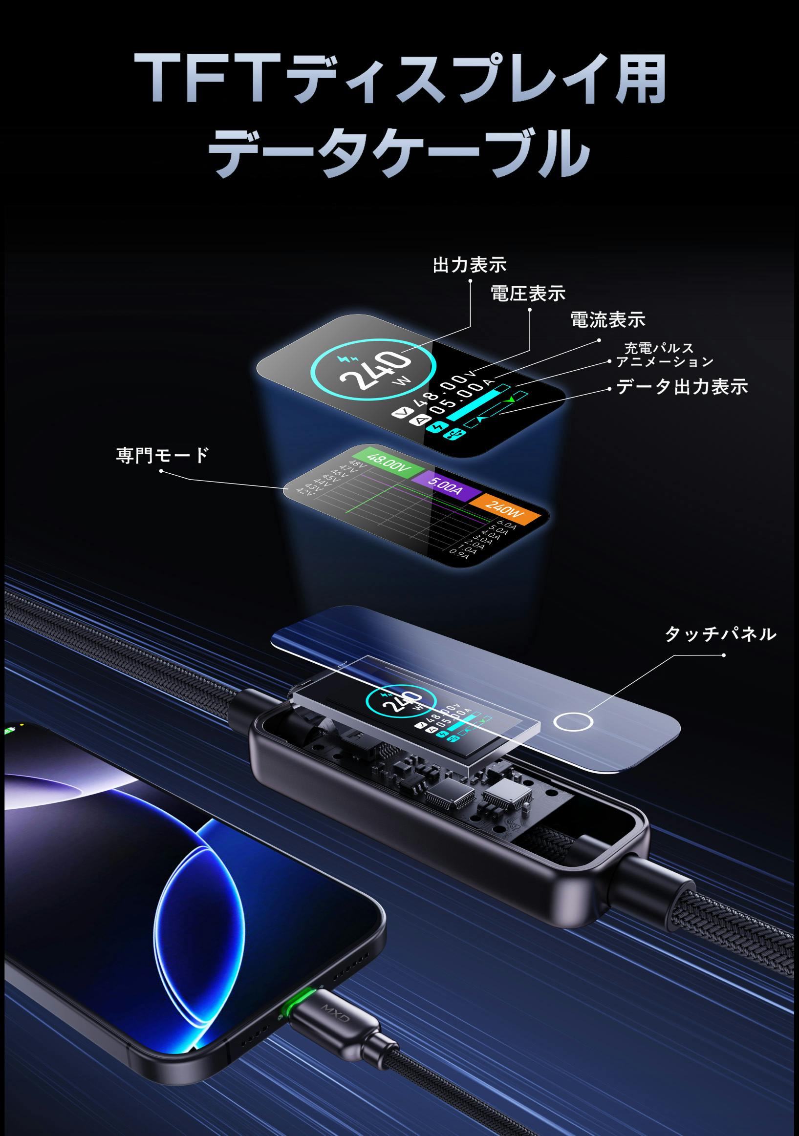 「ただの充電ケーブル」ではなく、**可視化ケーブル**という新しいコンセプト。240W超高出力、LEDインジケーター、リアルタイム液晶表示を搭載し、「急速充電」「データ転送」「充電状況の見える化」「高耐久」を1本で実現。