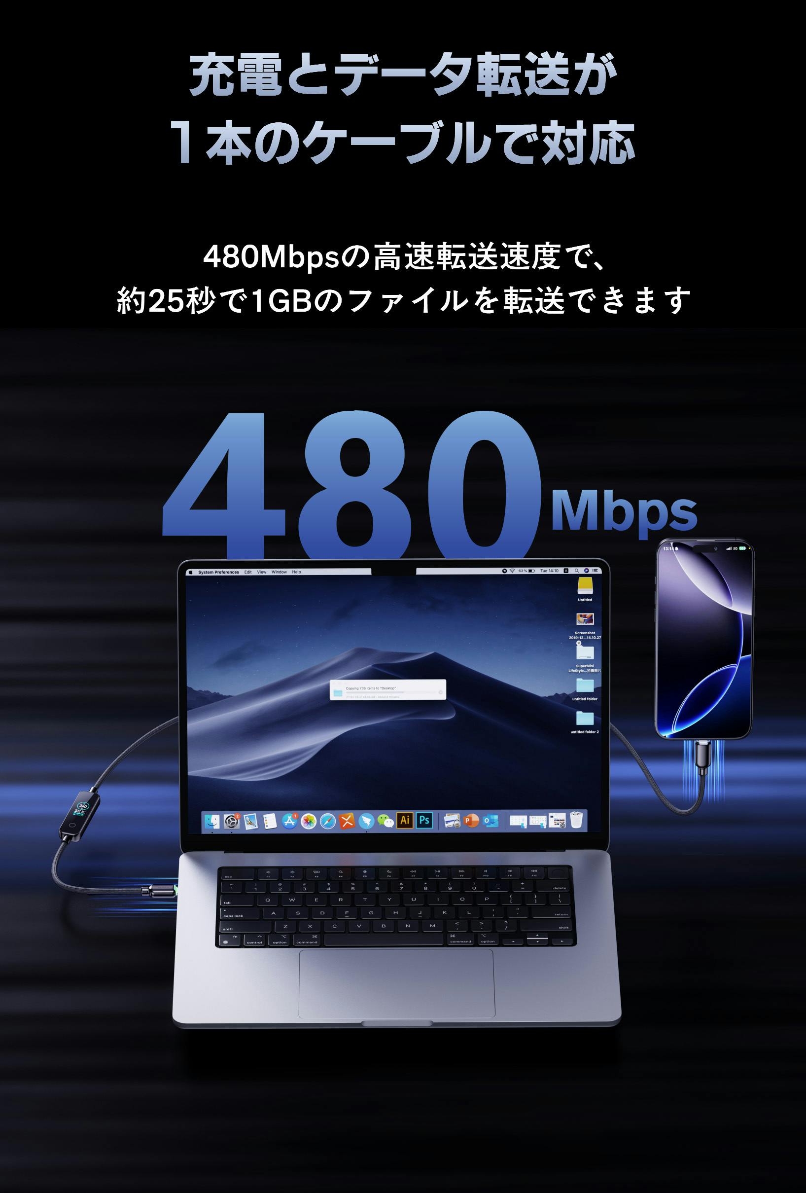 最大480Mbpsの高速データ転送に対応。ケーブル一本で「充電+データ移行」を同時にこなせます。