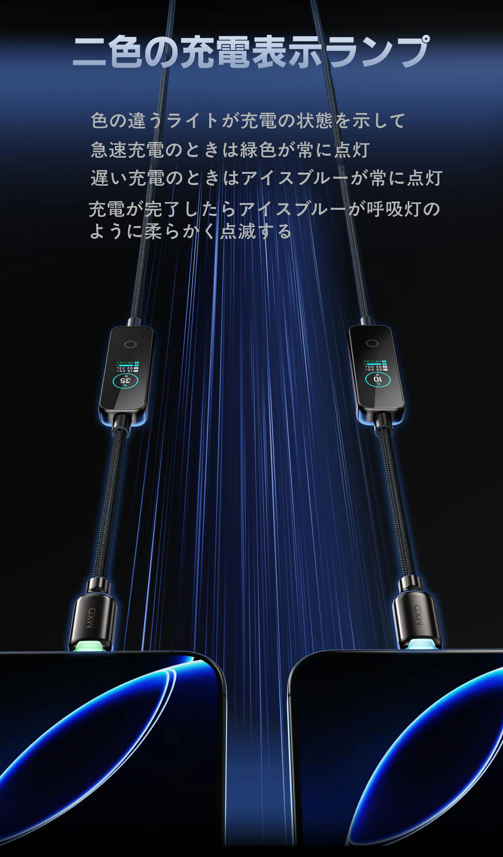 「ただの充電ケーブル」ではなく、**可視化ケーブル**という新しいコンセプト。240W超高出力、LEDインジケーター、リアルタイム液晶表示を搭載し、「急速充電」「データ転送」「充電状況の見える化」「高耐久」を1本で実現。