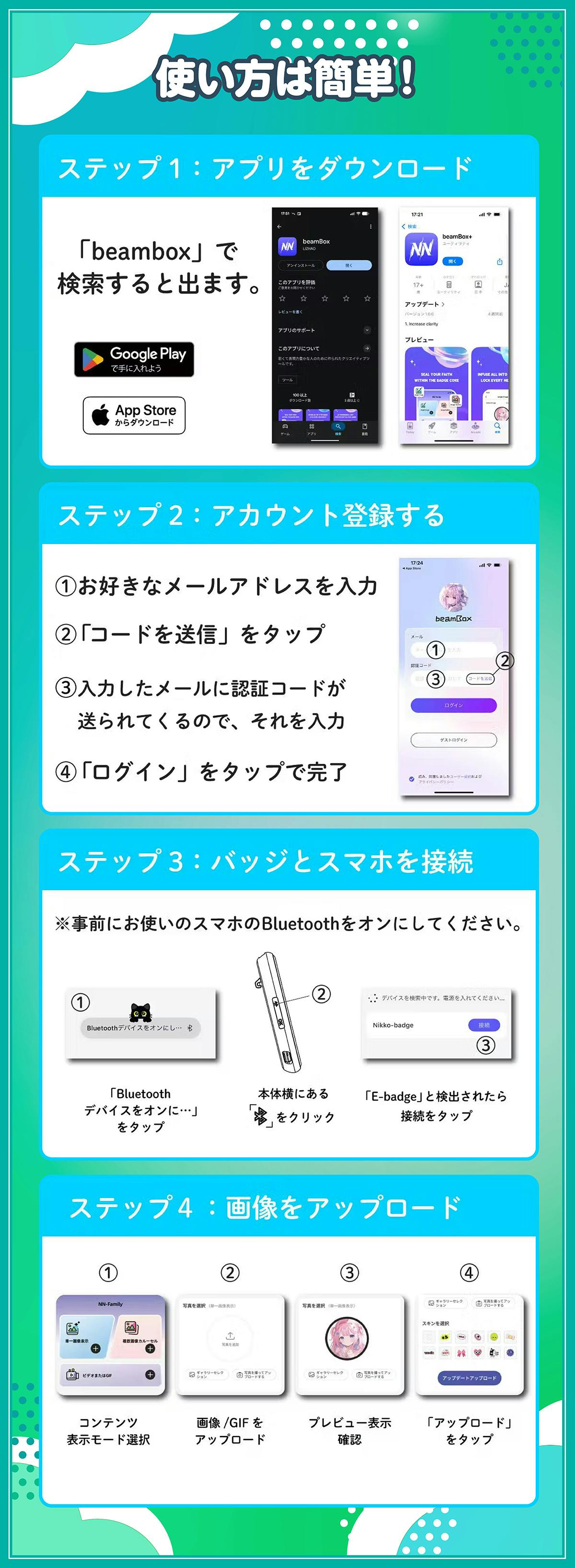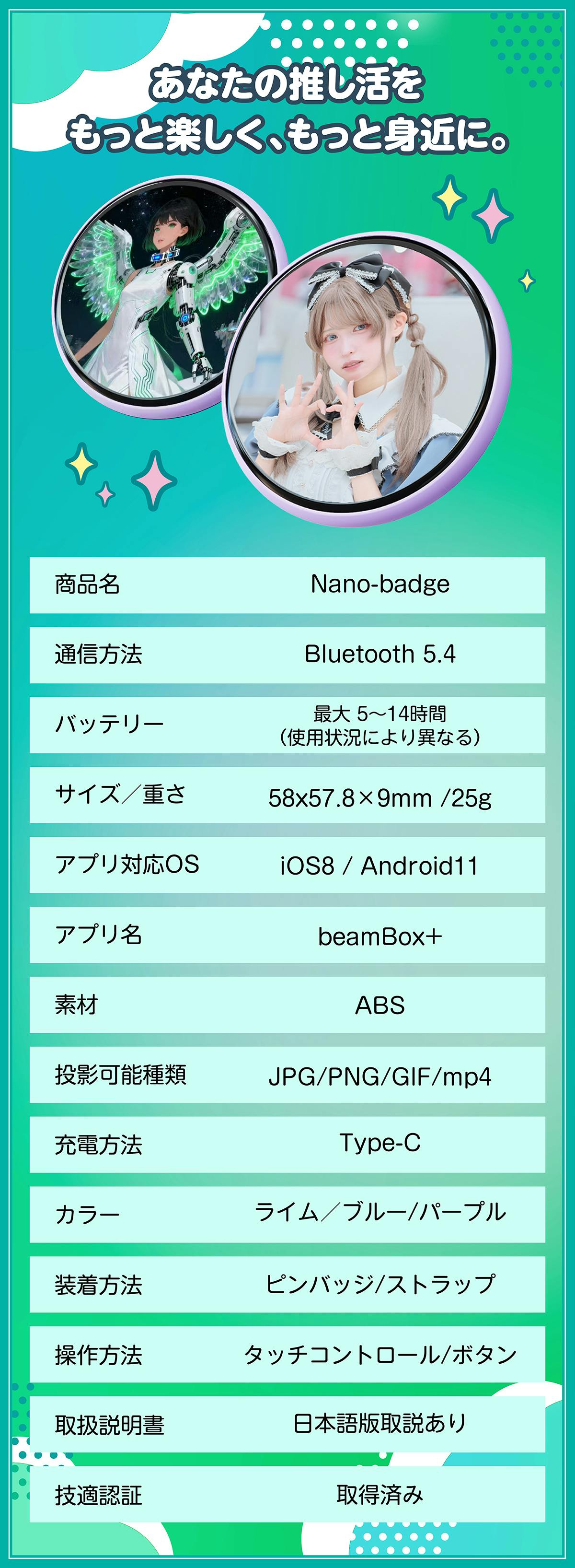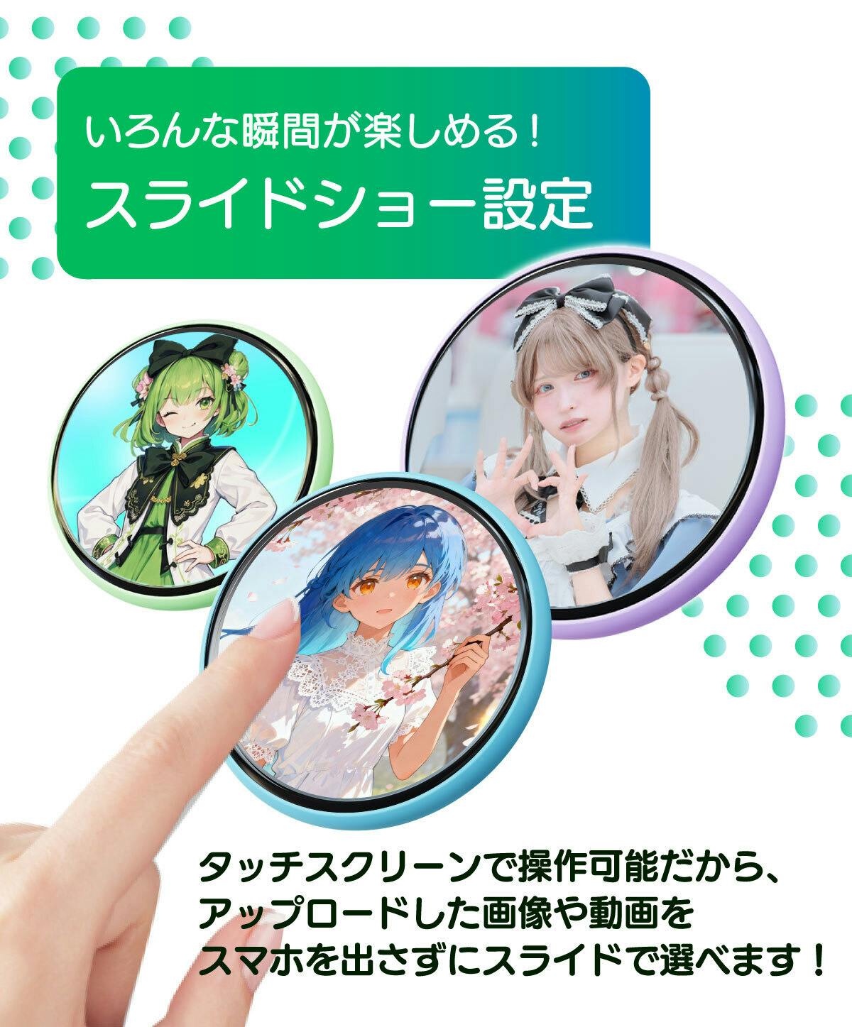 お気に入りの写真やGIFをBluetoothでスマホの専用アプリから転送するだけ!ライブやイベントでも、あなたの「推し」が輝く瞬間をそのまま胸につければ、大注目間違いなし!