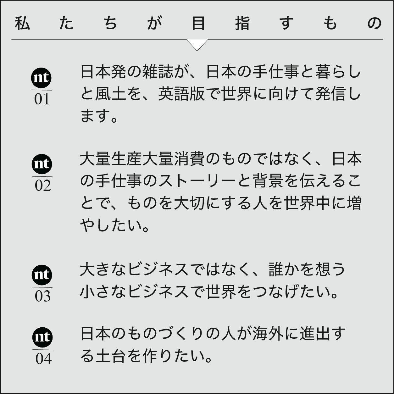 英語版nice things.を通じて、日本の手仕事と作り手の想いを世界中の人々に届けたいと考えています。単なる商品紹介ではなく、その背景にある職人さんのそこに至るプロセス、生き方やものづくりに関する考え方を丁寧に伝えていきます。