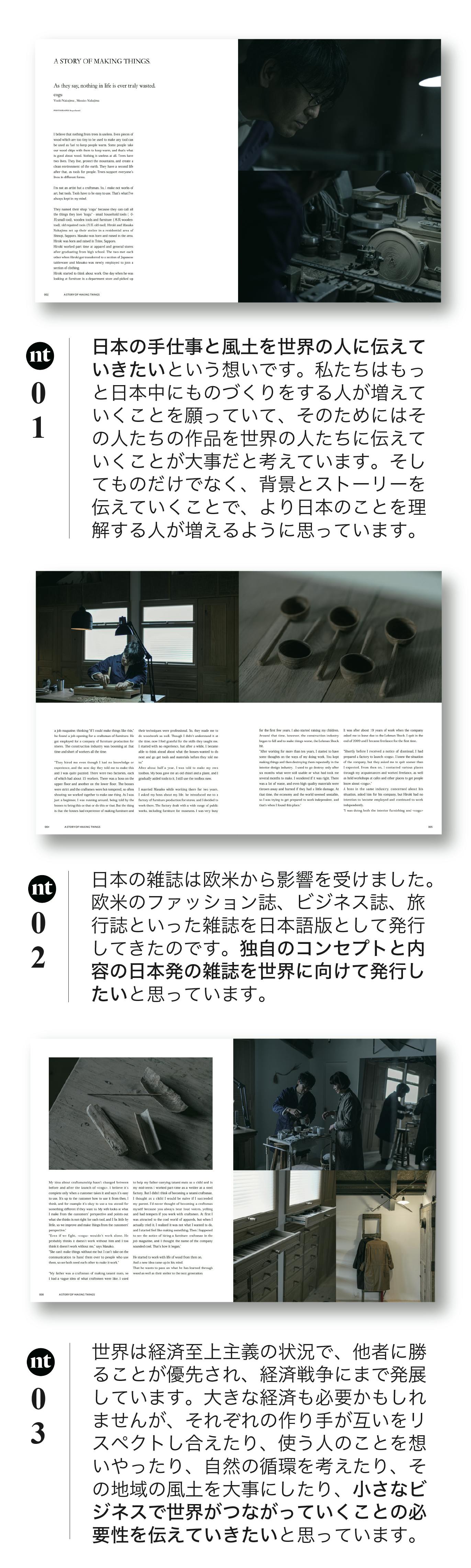 英語版の創刊号では、これまでnice things.で取材してきた作り手の人たちのものづくりの背景からストーリーを綴っていきます。その“もの”の背景を伝えることで、ものへの愛着、風土、文化、歴史、そして何より共感がつながっていくことになると思っています。