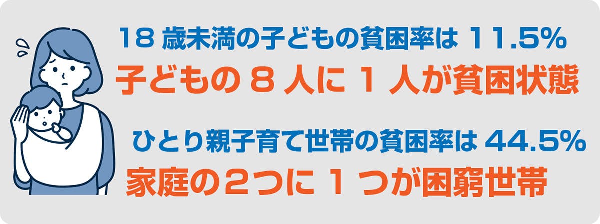 日本において、18歳未満の子どもの貧困率は11.5%、子どもの8人に1人が貧困状態となっています。大人一人で子どもを育てる世帯の貧困率は44.5%にもなります。(※厚生労働省発表、2022年国民生活基礎調査より、貧困率は大規模調査年のみ掲載)