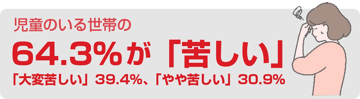 長引く円安による物価高は家庭を直撃し、生活費はかかるばかりで、子どもを育てていくのはとても大変な現実があります。生活意識の状況 として、「苦しい」の割合は、「児童のいる世帯」では 64.3%(大変苦しいが39.4%、やや苦しいが30.9%)と、前回調査より増加しています。(※厚生労働省発表、2024年国民生活基礎調査より)