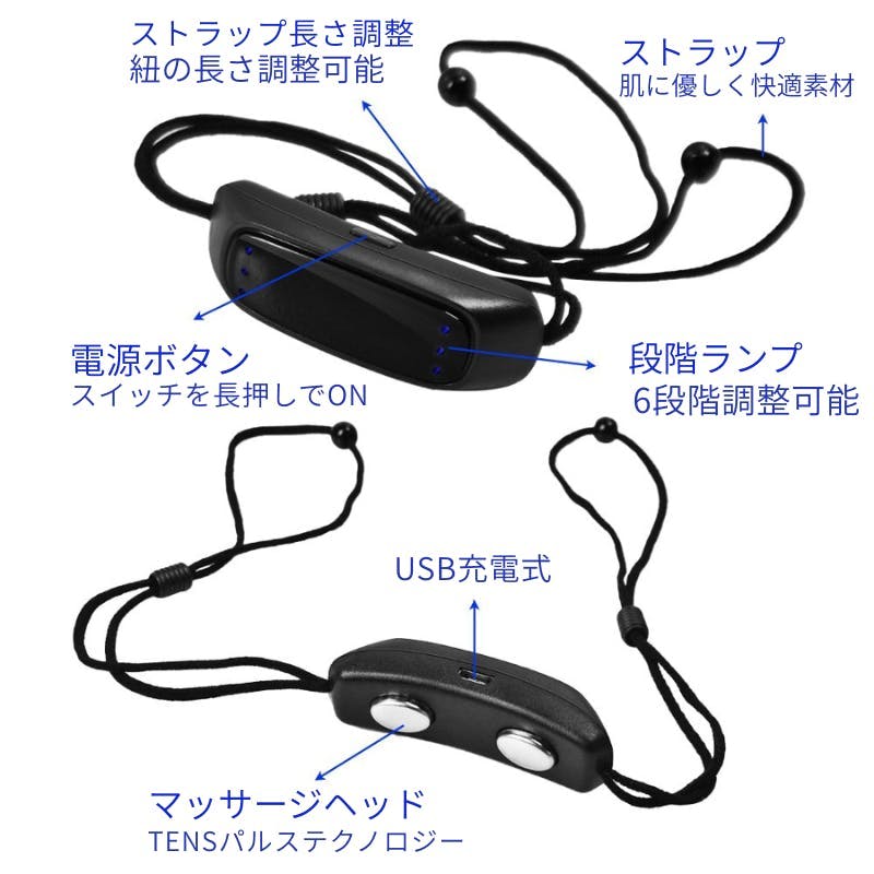 専用の付属ストラップを使い、デバイスを「あご下」または「喉仰部」(のどぼとけ付近)に装着します。肌にやさしい素材で、長時間の使用も安心です。