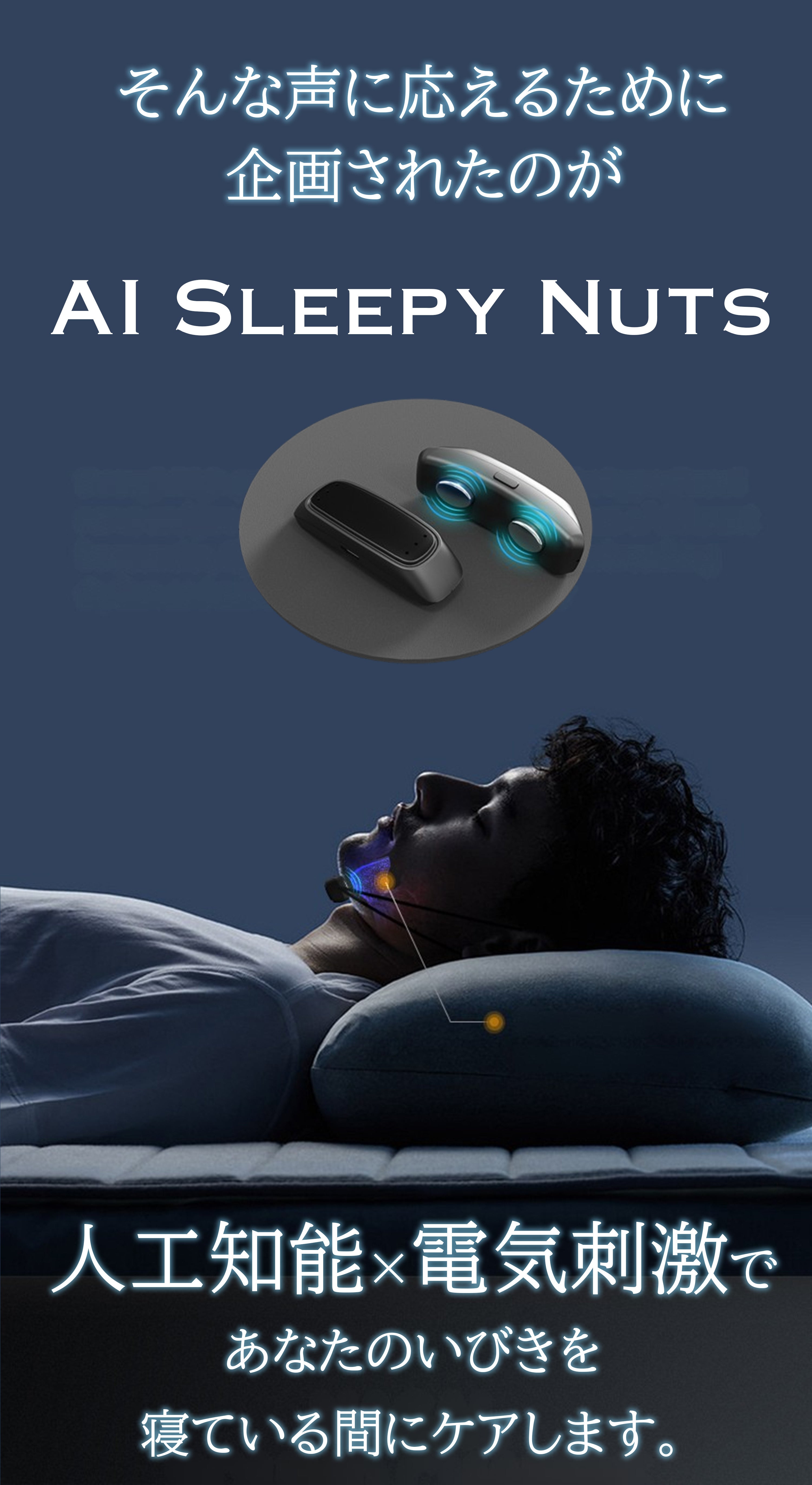 AI Sleepy Nuts は、AIがいびきを検知して自動で微弱なEMSパルスを送り、眠りを妨げずにいびきをケア。睡眠中の健康リスクや人間関係の悩みを、そっとサポートします。