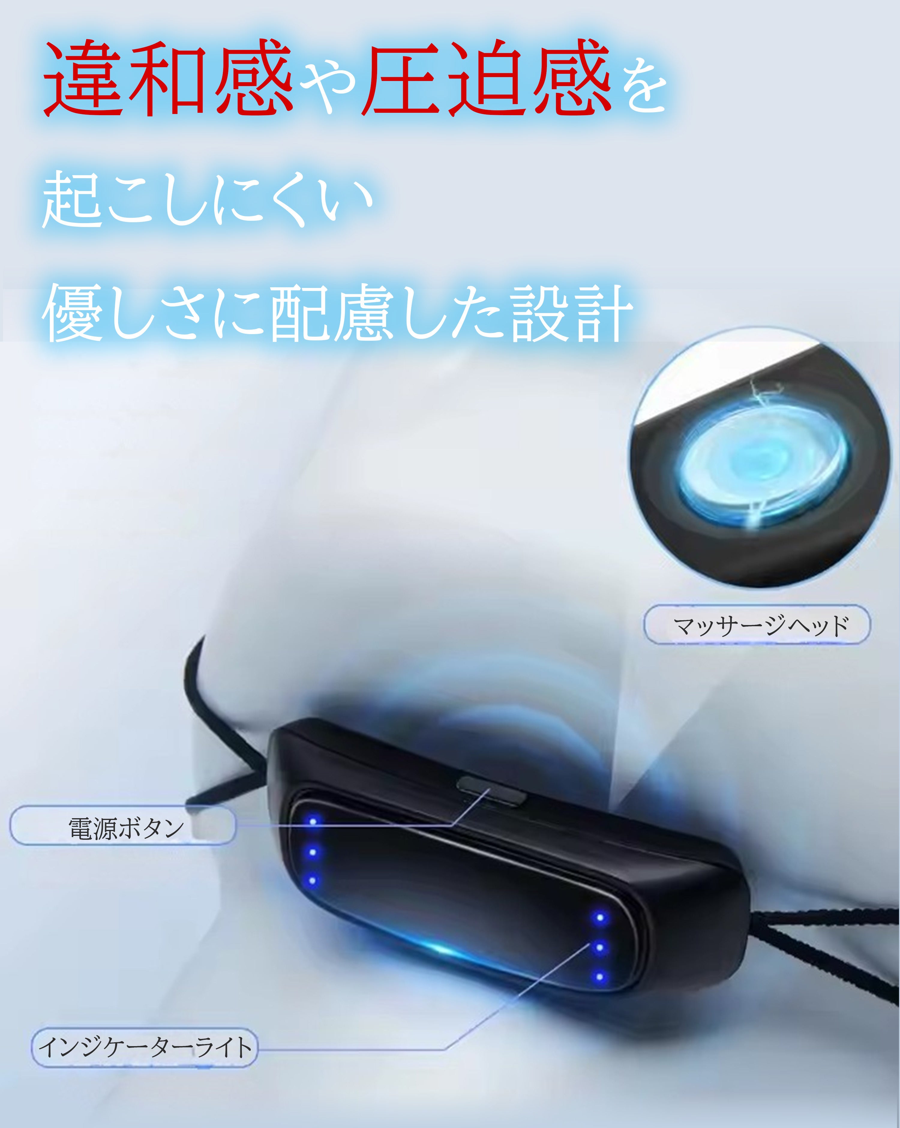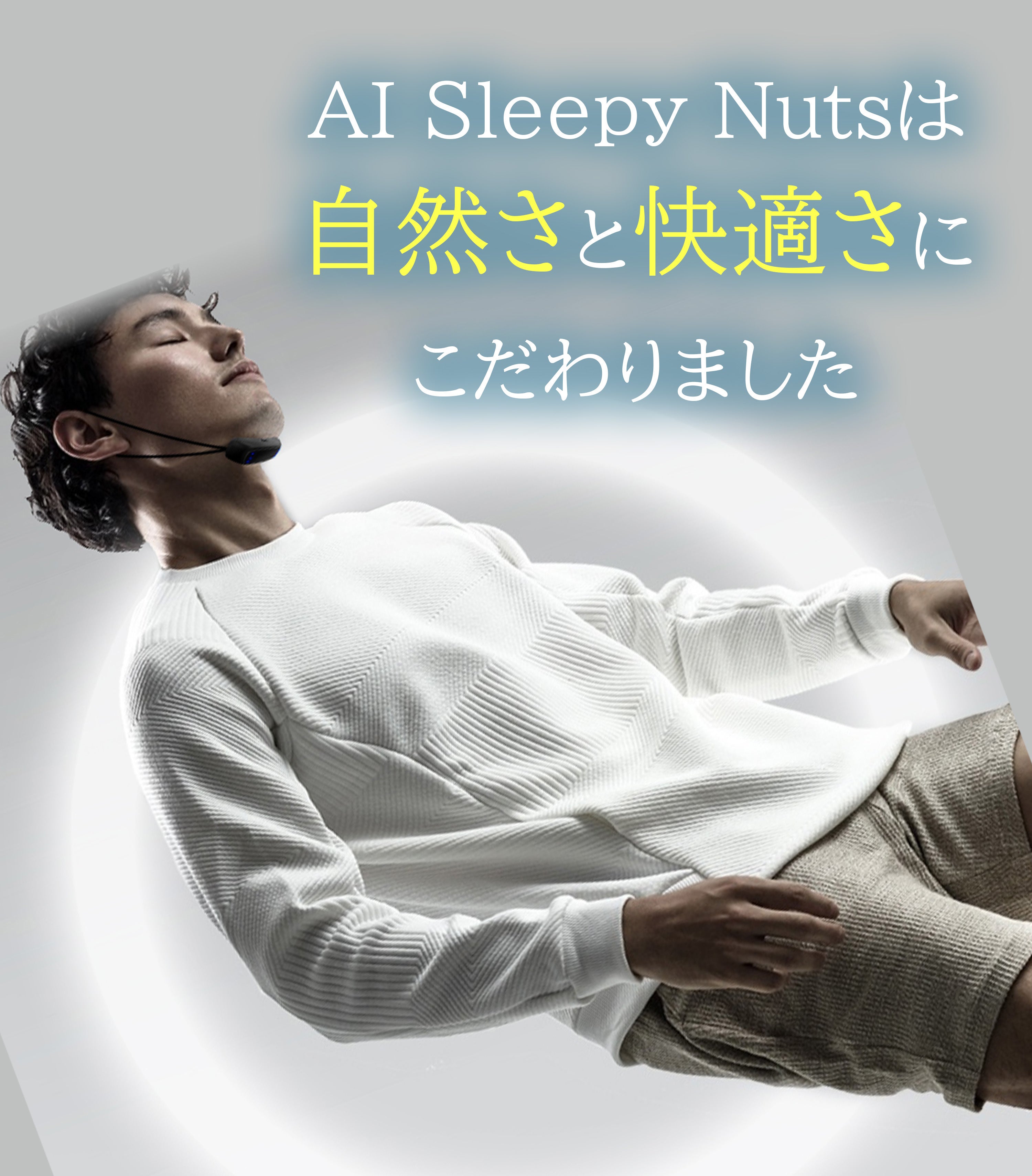 マウスピースのように顎を固定したり、強制的に呼吸を変えるのではなく、あくまで軽い刺激により、就寝中の動きや姿勢の変化を促すサポートを行います。そのため、不自然な圧迫感がなく、着けたままでも眠りを妨げにくい構造となっています。 -