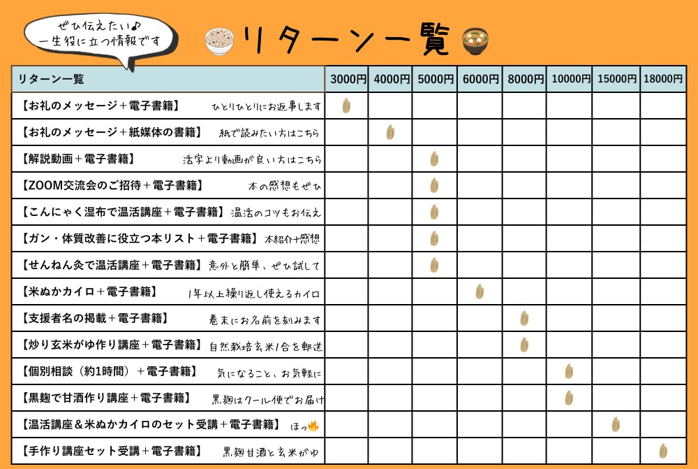 ご支援いただいた皆様には、完成したKindle本をお届けするのはもちろん、制作過程での限定情報の共有や、私が実践してきた発酵や温活といった、体質改善のメソッドなどもご用意しています。