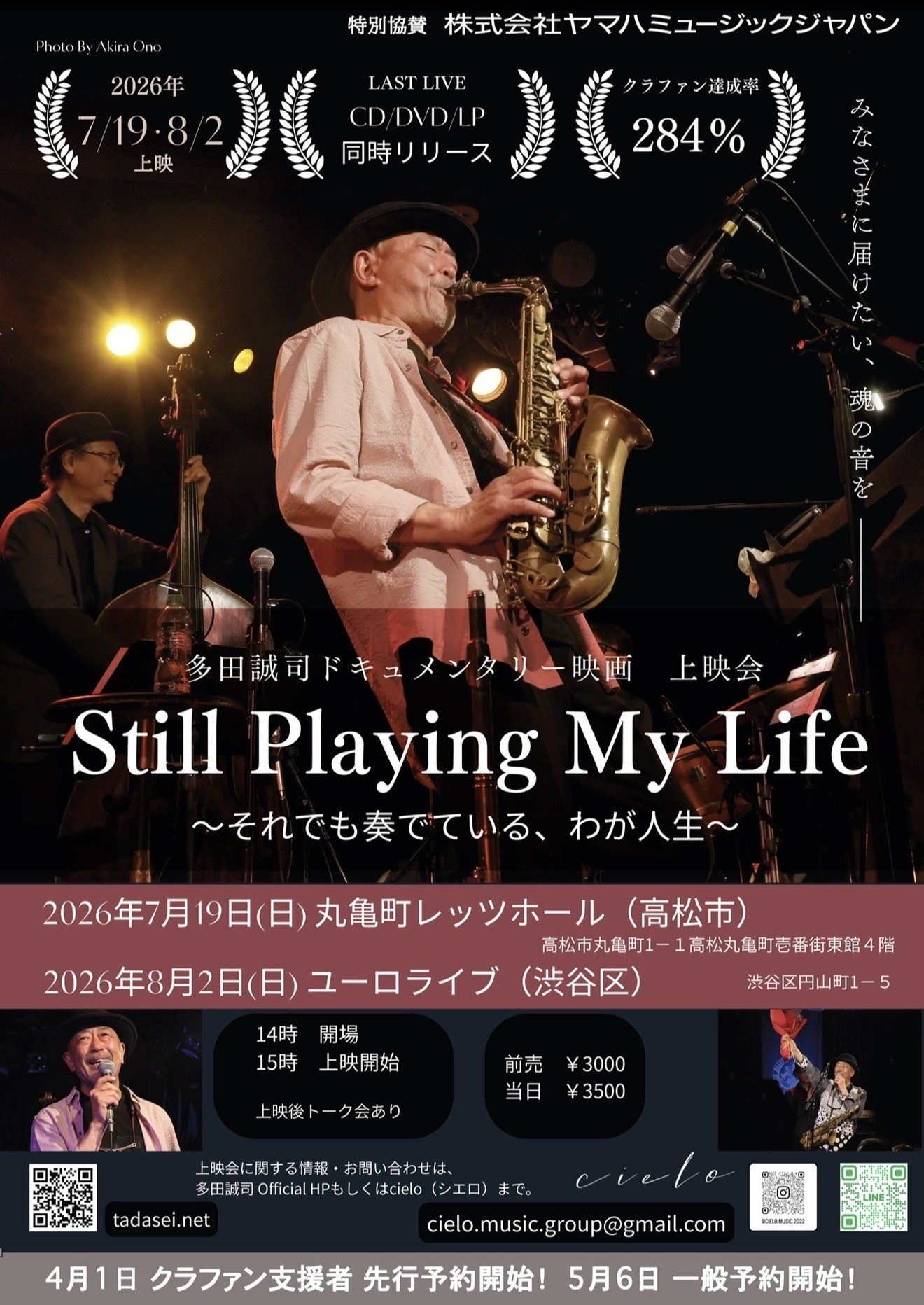 先行予約の開始日が近づいてまいりましたね。4月1日以降、皆様からのご連絡を是非是非お待ちしております!先行予約はクラファン支援者のみとしておりますので、クラファン内のメールより、①会場名②代表者のお名前③人数 をお知らせください。また、近日中に東京と高松以外の上映会の現時点での日程も発表いたしますので、楽しみにお待ちくださいね。映画上映にあたって、多田誠司さん、ウスイヒロシ監督、cielo(シエロ)大林杏子 より お知らせがございます。【多田さんより】皆様、こんにちは!多田誠司です。多くのご支援をいただいた映画の制作、快調に進んでおります!皆様からいただいたご支援金を大切に使わせていただきながら、より良いものを目指して頑張っています!完成を楽しみにお待ちください。この映画は、映画館での上映を念頭に置いていなくて、いわゆるフィルムではなくデータを持ち歩いての上映となります。そのあたりをご理解いただき、僕がこれまでお世話になった全国のファンの皆様に少しでも多くご覧になっていただきたいので、ライブハウスや小ホールくらいまでのスペースで、主催もしくはご協力いただける方を大々的に募集いたします!こちらは機動力良く動きますよ!!僕の人生の集大成とも言える作品を、どうかごらんください!!【ウスイ監督より】もうすぐ4月。撮影を始めた2026年11月から半年が経とうとしています。こんな風に撮影が続けられるのは、みなさんのお気持ちが集まったクラウドファンディングがあったからこそと実感しております。改めて本当にありがとうございます。みなさんのお気持ちに応えられる作品になるよう、チーム一同しっかり制作を進めております。完成までもうしばしお待ちください。制作を始める時に多田さんにお渡しした企画書にこんな文章がありました。"このドキュメンタリーは、多田誠司という一人の音楽家を通して探る「人生の新たなステージに向かう旅の記録」です。楽器を置くことは「別れ」ではなく「約束」であり、「これが最後の音ではない」という確信が、彼を生かしているのではないか。音楽家・多田誠司の人生を通じて、「音が消える瞬間」と「希望が生まれる瞬間」を同一線上に描き、冒頭の言葉を表したい”手術を終え、今、ほぼ毎日放射線治療を受け、地道にコツコツと希望に向かって進んでいる多田さん。その姿を撮影し制作を進めていると、まさに「新たな人生のステージで、どう生きるのか?」この言葉通りの思いを感じます。楽器を置くことになっても、多田さんのライフスタイルの根本は変わっておらず、その生き様に「人としてのエネルギー、喜怒哀楽のこもった感情」が溢れていると感じています。そして、ご本人は当たり前のように、静かにそれを積み重ねているってことが本当に素晴らしく、もう憎らしいくらいカッコいいのです。もちろん、多田さんには内緒の話ですが(笑)そう考えた際に、みなさんに届ける方法も、多田さんのライフスタイルの根本の1つでもある「LIVE」スタイルが良いのではないかな?と考えています。それは、「演奏を体験し、演奏後に交流もある」ように、「上映を観てもらい、上映後も交流がある」ような、LIVE演奏そのものの形態です。なので、上映会尺も60分から70分を目指します。例えば、1stセットが上映ならば、2ndセットは、その上映ごとに多田さんと相談して決められるような、そんな上映会になったら最高だなと思います。それはライブハウスでも良いし、大きな会場から小さな会場でも良いし、病院や学校でも良いのではないかと思います。「別れ」ではなく「約束」多田さんの人生の新たなステージを皆さんと体験できるように、チーム一同しっかりと制作を進めてまいります。「Still Playing My Life」を、引き続きどうぞよろしくお願いいたします。【cielo大林より】みなさま、こんにちは。cielo(シエロ)代表の大林杏子と申します。改めまして、多田誠司さんのドキュメンタリー映画制作の為のクラウドファンディングに多大なるご支援をいただき、ありがとうございました!皆様からお預かりした支援金は、合計の約20%がクラファンサイトへの手数料と消費税としてお支払いとなります。また、リターンに約30% 経費(現物と送料)がかかります。ですので、実際は合計の50%を、映画制作(撮影、データ編集、音作り、ナレーション)や上映会費(会場費、ポスターやフライヤー作成、運営など)に当てることとなります。ここ最近 ご支援いただいた皆様より、地元での開催を希望されるお声を多くいただき、とてもありがたく思います。今回の映画は、多田さんが今まで楽器を持って全国でツアーを行なっていた延長として、これからは楽器の代わりに映画を持って皆様の街にお伺いできたらいいのではと。そのため、映画といえば映画館で!という方向性ではなく、みなさまと距離の近い、多田さんと馴染みのライブハウスやイベントスペースでの上映を主に検討してい