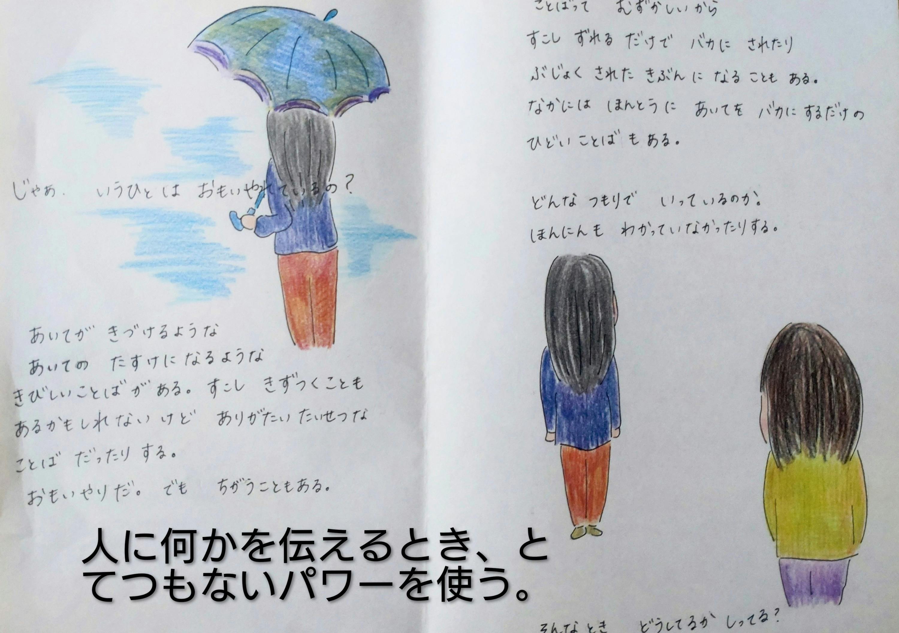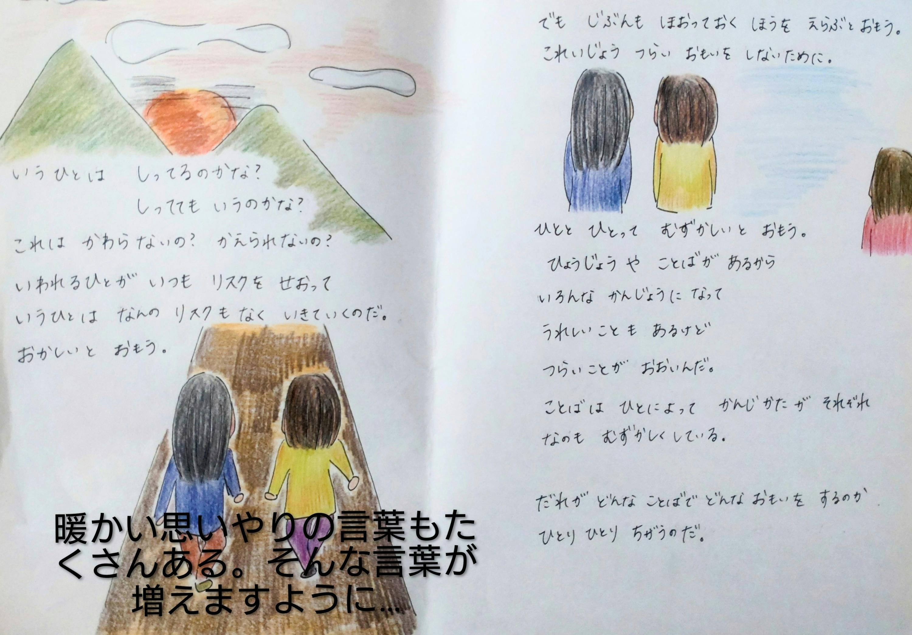 言葉で思いを伝えることや人間関係の難しさをテーマにした絵本『いうひといわれるひと」を拝見しました。作者自身や子どもが実際に経験した人間関係とそれに伴う想いが基になっているとのことで、非常に現実的かつ切実な内容です。自分自身の対人スキルやコミュニケーション能力に至らぬ思いを抱いていたり、他人を傷付けるような言葉を平気で使う同じコミュニティに属する者との関係に悩んでいる人などから、共感を得られそうな作品だと感じました。
