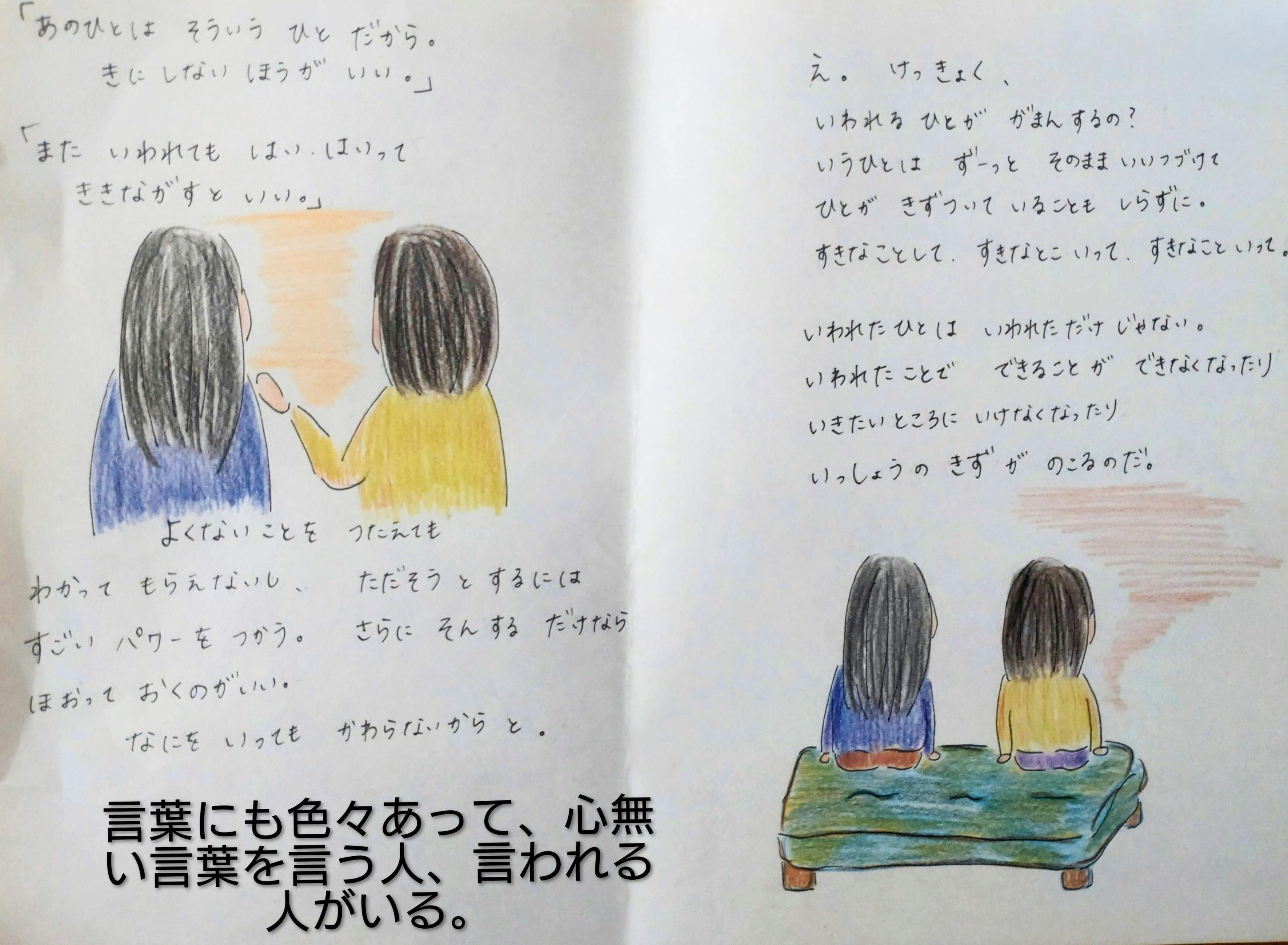一方、そういった葛藤などなく自分の想いを伝えられる人については、厳しい言葉であっても、思い遣りゆえであれば「ありがたい たいせつなことば」と評価しています。ただし、「あいてをバカにするだけのひどいことば」を無自覚に使う人もいると考えてもいます。そして、ここで現れるもうひとりの女性との会話を通して、