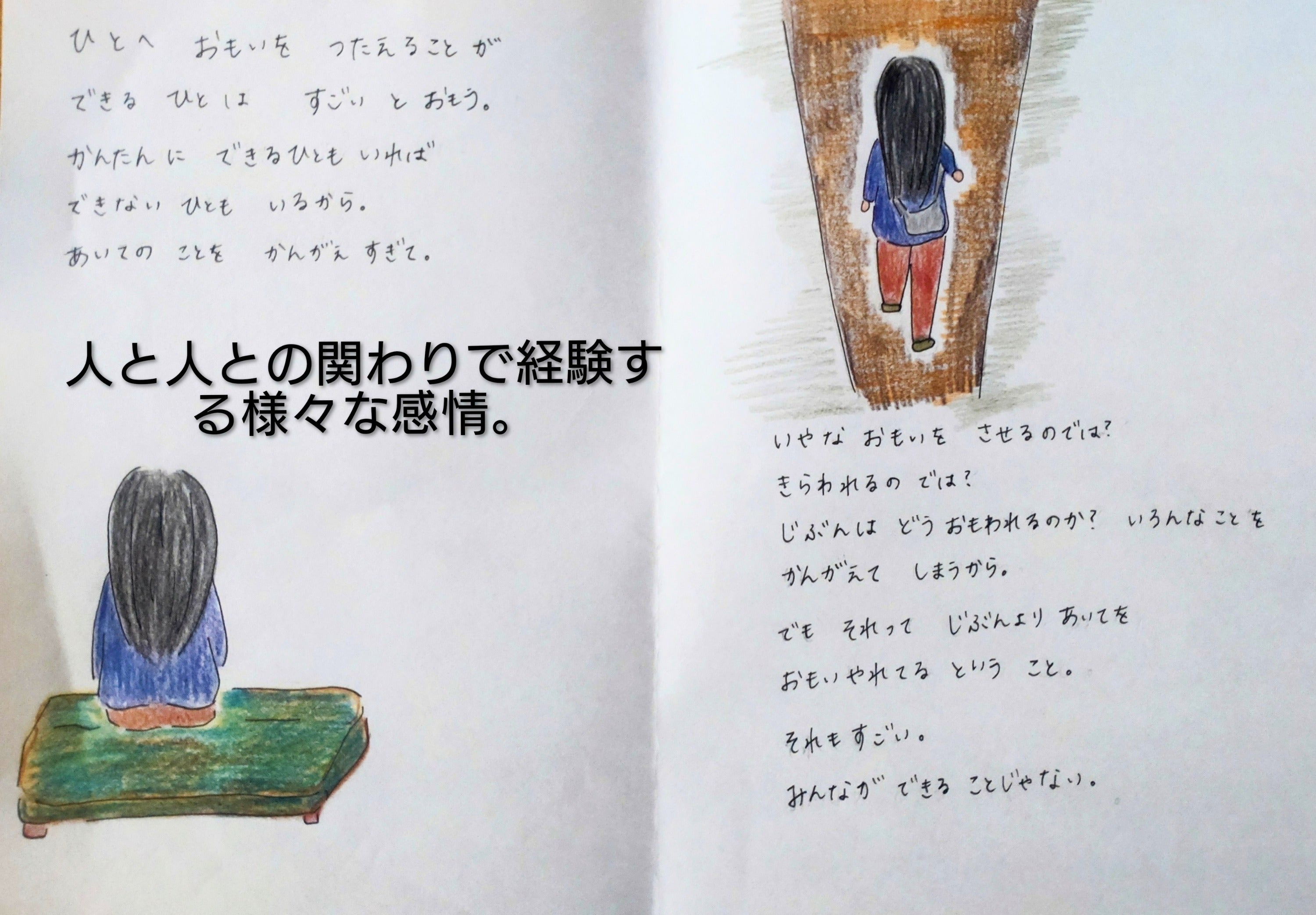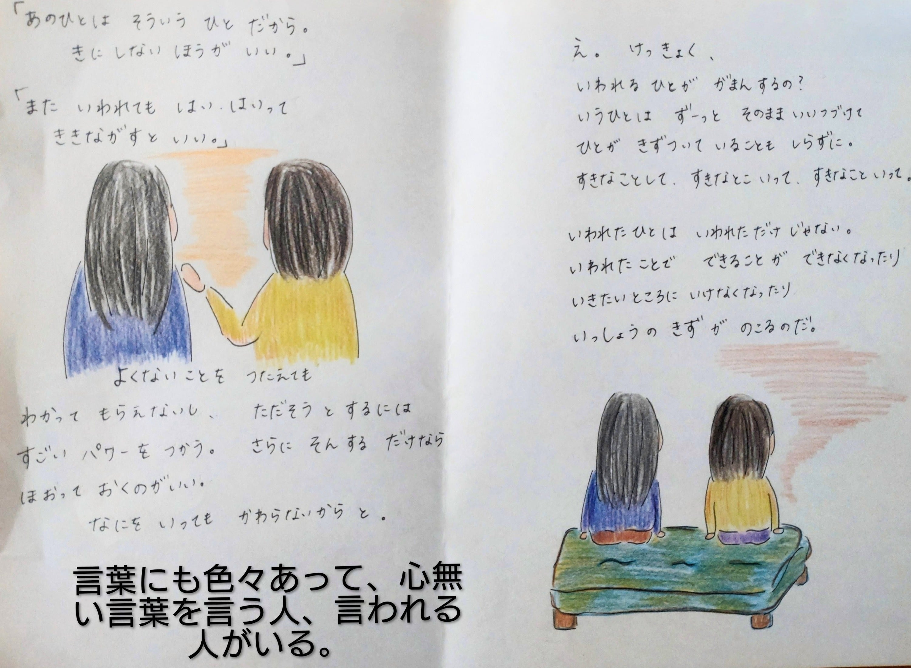 言葉で思いを伝えることや人間関係の難しさをテーマにした絵本『いうひといわれるひと」を拝見しました。作者自身や子どもが実際に経験した人間関係とそれに伴う想いが基になっているとのことで、非常に現実的かつ切実な内容です。自分自身の対人スキルやコミュニケーション能力に至らぬ思いを抱いていたり、他人を傷付けるような言葉を平気で使う同じコミュニティに属する者との関係に悩んでいる人などから、共感を得られそうな作品だと感じました。