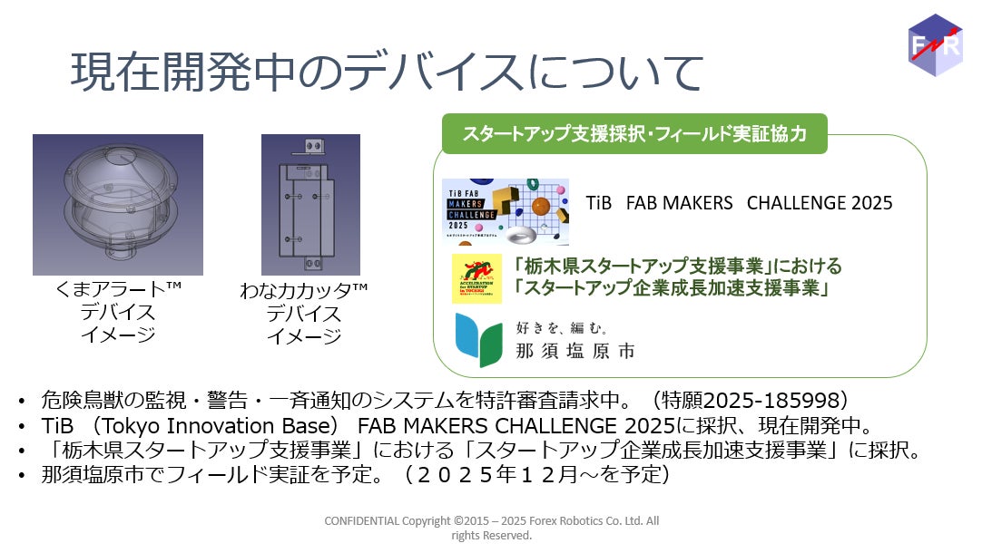 ・TiB(Tokyo Innovation Base)FAB Makers Challenge 2025に採択いただき、「くまアラート™」および「わなカカッタ™」のハードウェアの開発指導をいただいてます。