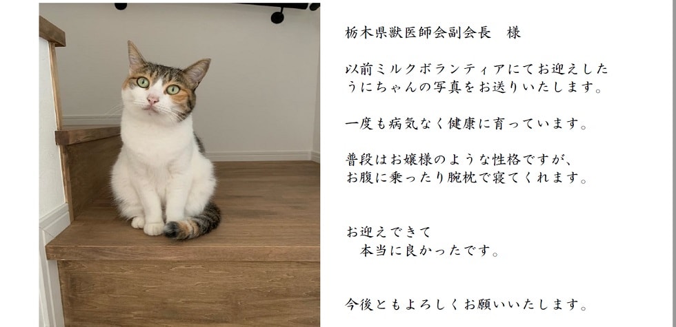 離乳前の子猫の飼育支援を適切な技術と環境を有する動物病院で行うことで、病気のない健康な猫が譲渡可能な状態まで育成され、また、動物病院がかかわることで、新たな飼い主も猫の健康に関して安心して引き取れることから、殺処分数を削減していくには非常に重要な取組であります。今後も当会として引き続き積極的に関わっていきたいと考えております。