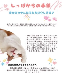 宇都宮市が収容した離乳前の幼弱子猫を市内の動物病院で預かり、病気の診断治療を行った上で、健康維持や体力確保のための一時飼養を行い、宇都宮市に返還し、譲渡会で新たな飼い主へ引き渡されます。