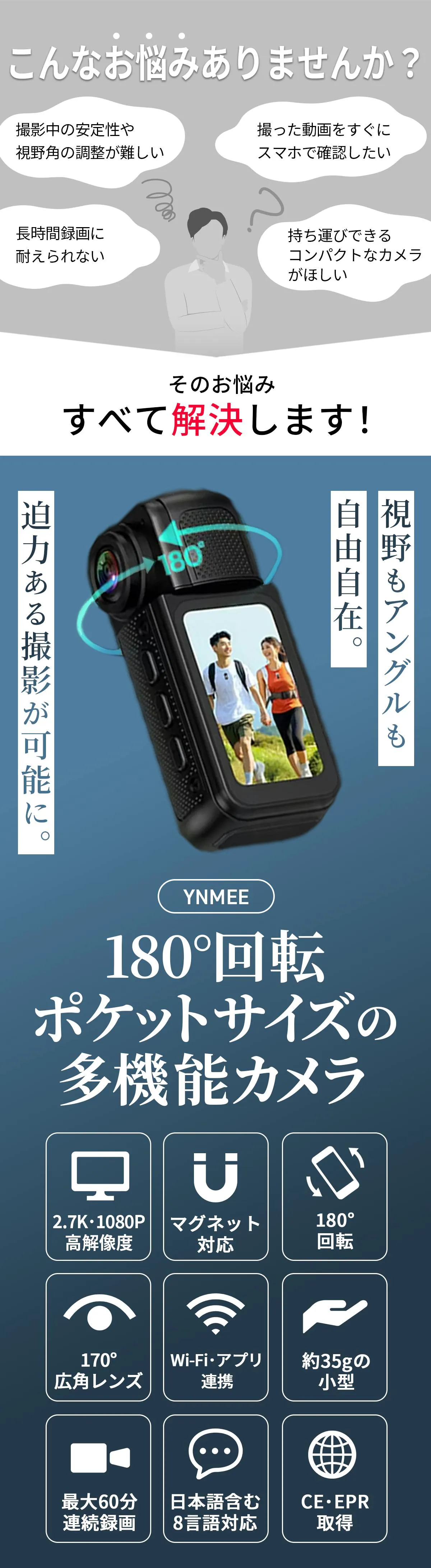 このプロジェクトでは、2.7K高解像度と180°回転×170°広角レンズを備えたアクションカメラを紹介します。アウトドアや旅行での臨場感あふれる映像撮影を可能にし、内蔵Wi-Fiでスマホから簡単操作も実現。
