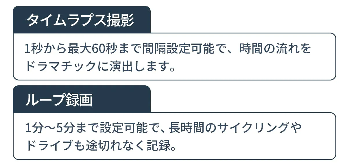 旅の絶景も仲間との瞬間も臨場感そのままに残せます。タイムラプスは1〜60秒間隔、ループ録画は1〜5分設定可能。映像とともにクリアな音声も記録し、臨場感を再現。