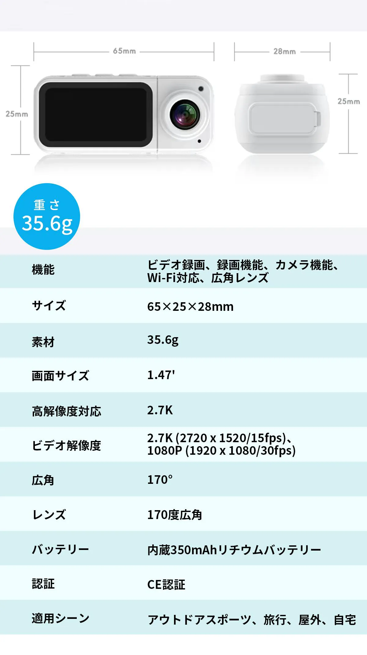 「S70」は約35gの軽量ボディに350mAhバッテリーを搭載し、最大60分連続撮影。USB Type-Cで約30分フル充電でき、外出前でもすぐ準備OK!