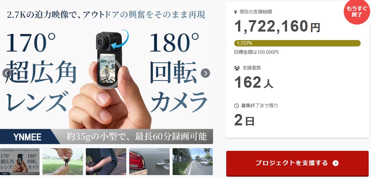 プロジェクト終了後、「2.7K高解像度170°広角×180°回転 - ポケットサイズの多機能カメラ」をCampfire特別価格で入手することはできなくなりますので、ご支援がまだの方、追加支援をご検討の方はお急ぎくださいますようお願い申し上げます。