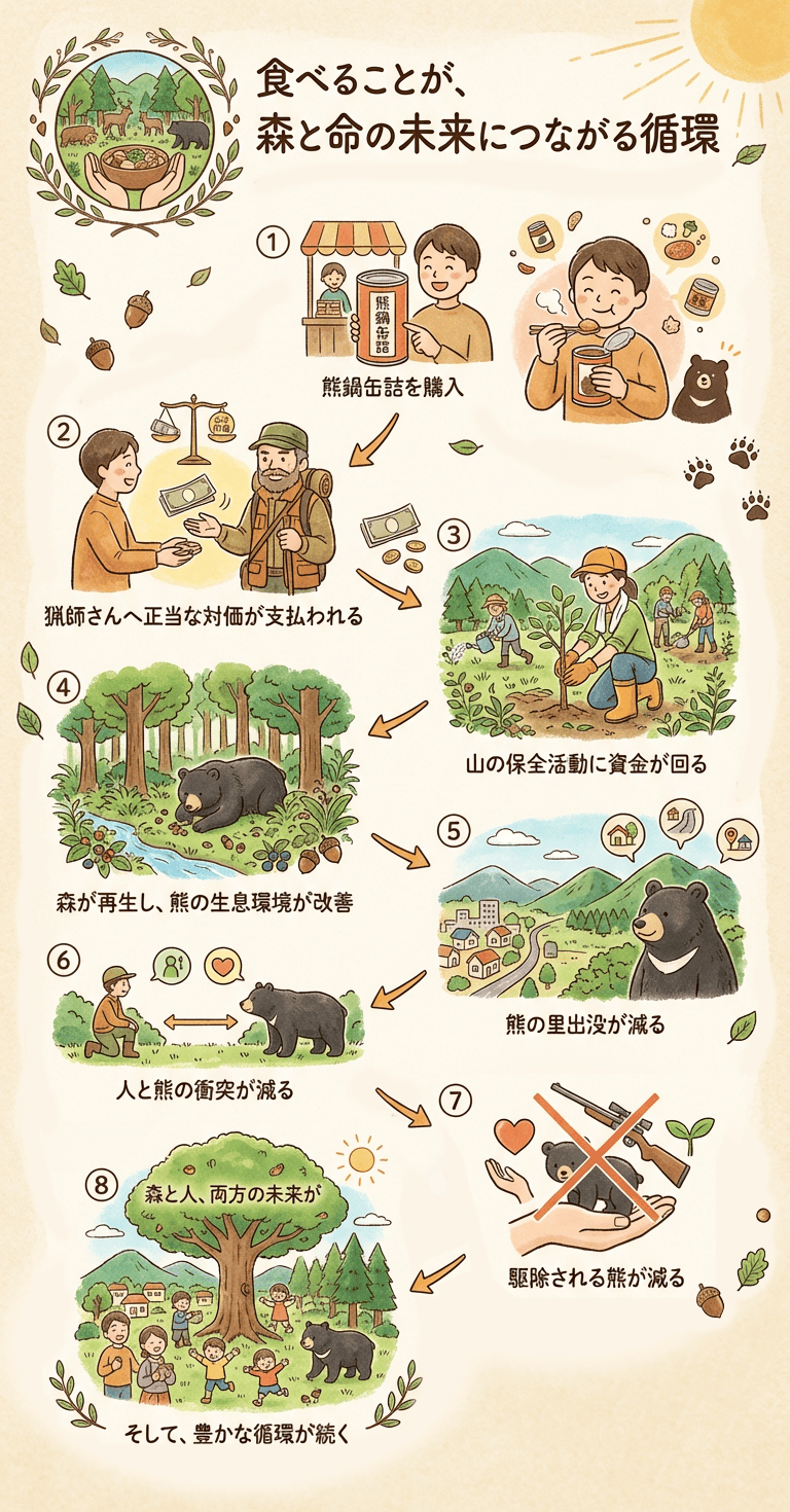 山の問題は、本来一般の人が関わりにくい領域でした。しかし「缶詰を買う」「ギフトにする」という行動なら、誰でも簡単に 森を守る仲間 になれます。この「熊鍋の缶詰」が広がることで、「美味しい → 応援になる → 森が再生する」という 誰もが参加できる保全モデル が生まれます。