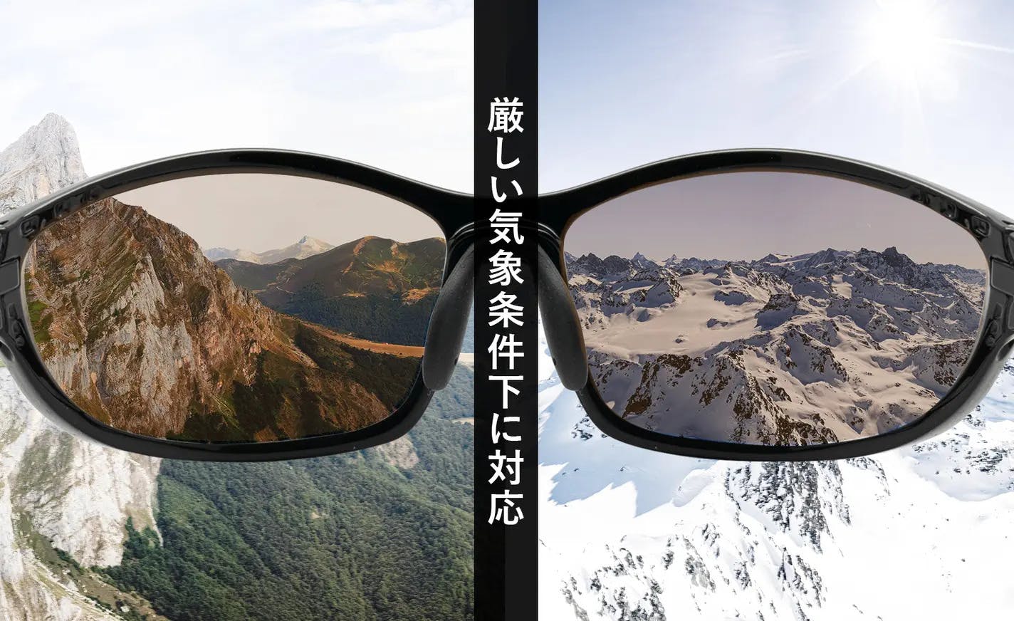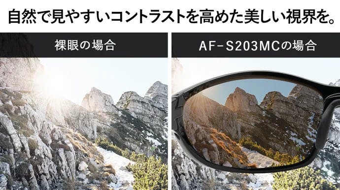 - 冬山の過酷な状況下でも高い防眩効果を誇り、かつ単に視界が暗くなるだけでなく色調をより損なわず、より自然に近い視界で見やすいレンズです。美しい景色はそのまま美しく、よりコントラストを高めた視界をお届けします。(※上記は比較するため加工された画像で、実際には見え方が異なる場合があります)