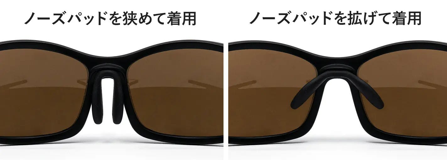 レンズが頬にあたる場合はノーズパッドを狭め、サングラスと顔の間の隙間をなくしたい場合はノーズパッドを拡げるようにして、お好みのフィット感に調節できます。 -