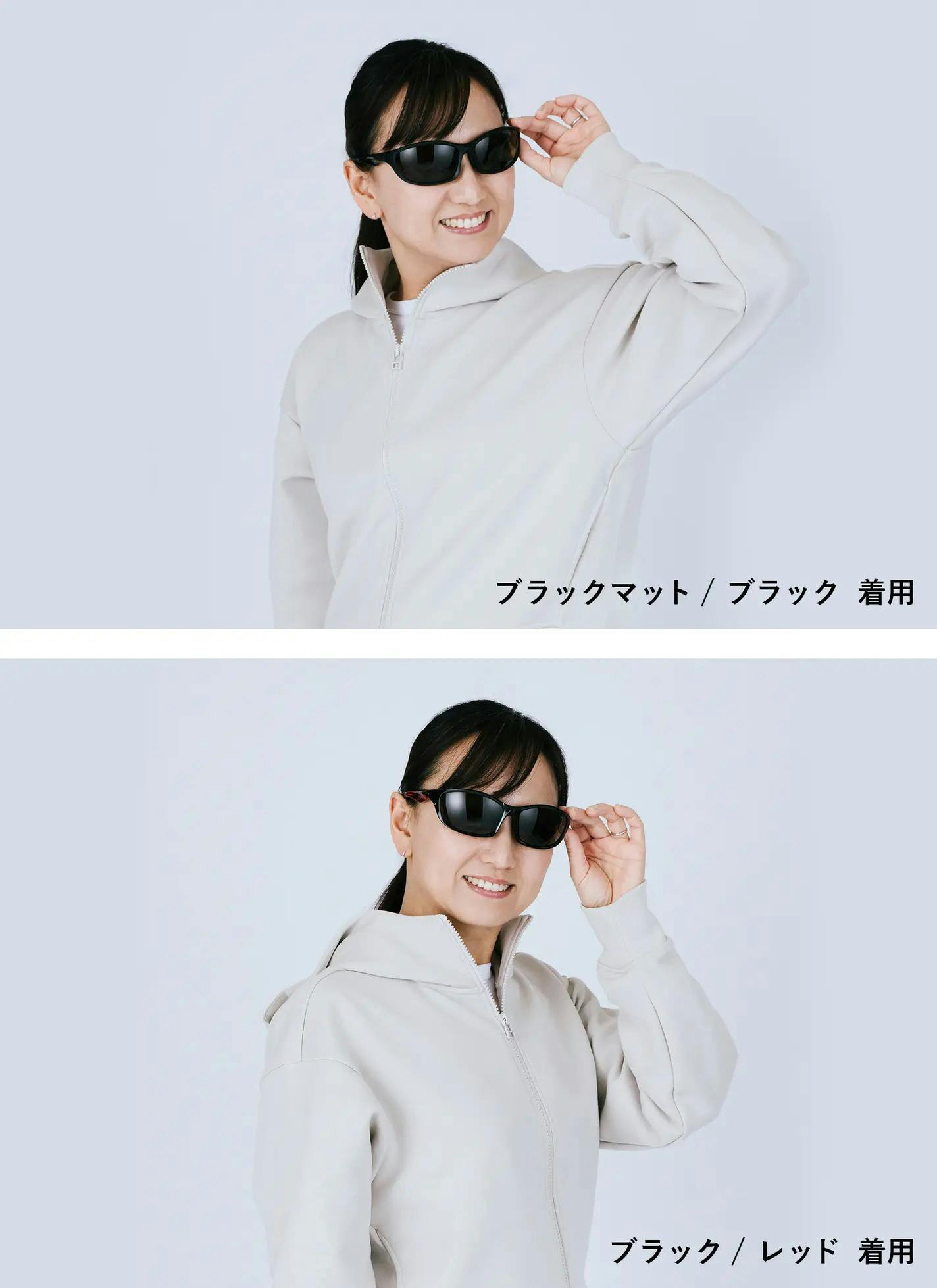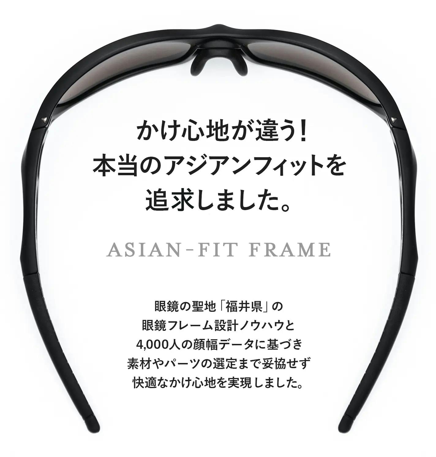 日本人の顔は、欧米人に比べて平面的で、前面はひろくなっているため、欧米人向けのフレームだと締め付け感が強く、ずれが生じやすくなります。特に8カーブ系のサングラスは、鼻の上部に隙間ができ、見え方も見た目も悪くなりがちです。AF-S203MCのフレーム設計は、日本人の顔に合わせた設計を行っており、さらに調節可能の鼻パッドと耳掛け部(テンプルエンド)を採用し、かけ心地、かけた際の格好良さに自信を持っておすすめします。