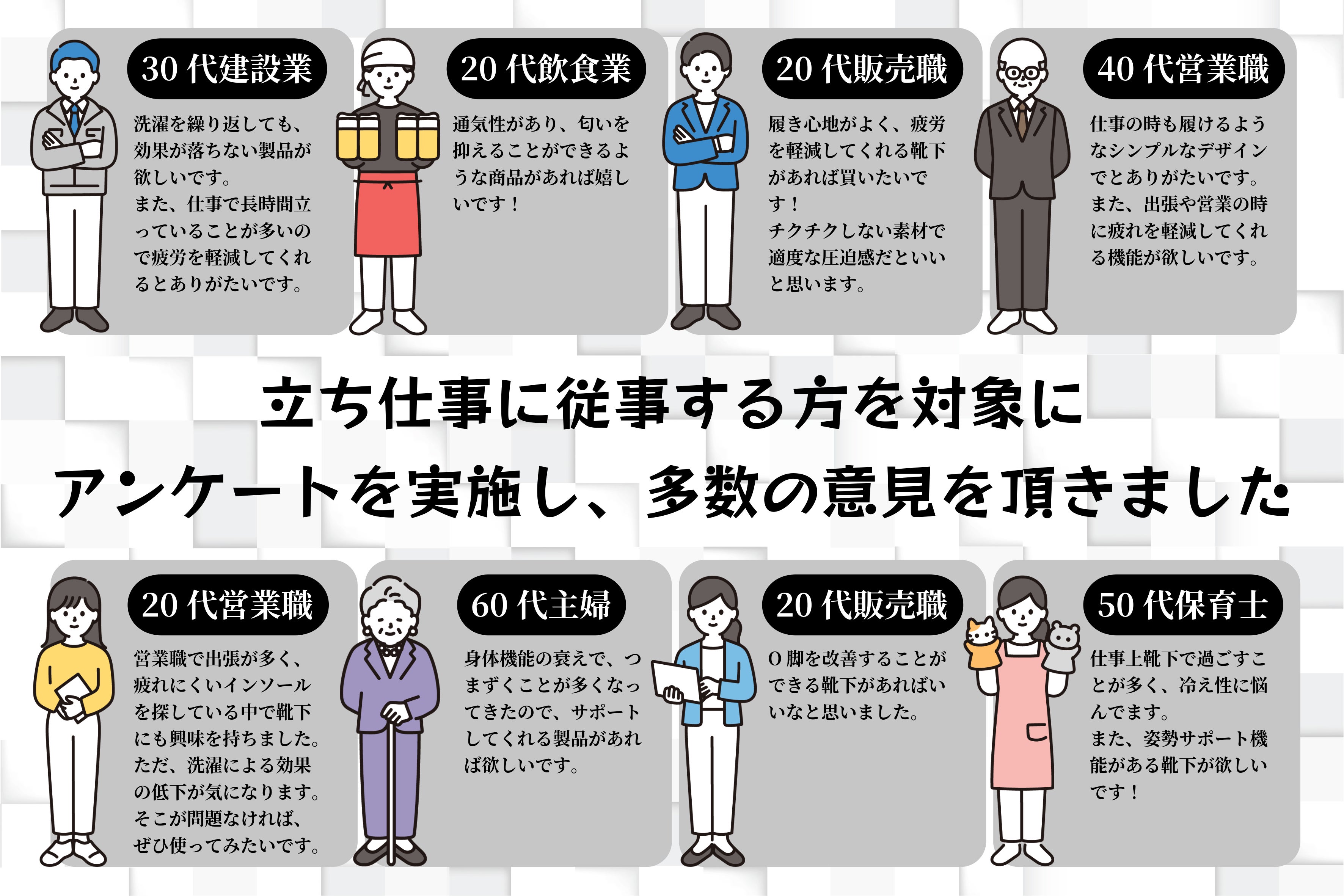 高齢者が外出を楽しめる社会や、立ち仕事の方の毎日を応援したい。歩ける今を守りたい。