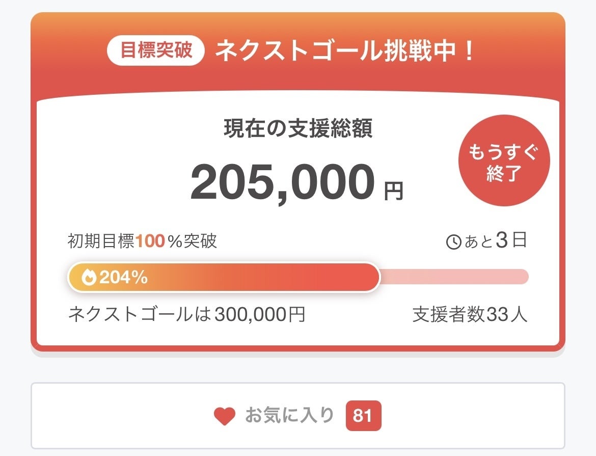 こんばんはいつも応援ありがとうございます。11/18に始めたこのプロジェクトあとさ残り2日で終わってしまいます。おかげ様で10、20万達成お気に入りも現在82あります(12/16の2時頃)今はNEXTゴールの30万に挑戦中です。商品のことを考えると正直必ず達成させたいです。達成できれば、・初回ロットの品質を妥協せずに生産できる・今後も継続して届けられる形が作れるという、次につながる一歩になります。もし今、「ちょっと気になってる」「あとで支援しようと思ってた」そんな状態でこの活動報告を読んでくれているなら、ぜひ今日・明日のうちに一歩踏み出してもらえると嬉しいです。お気に入り登録してくださった方の中からほんの数人のご支援で、現実が変わるラインにいます。残り2日。最後まで、諦めずに走ります。