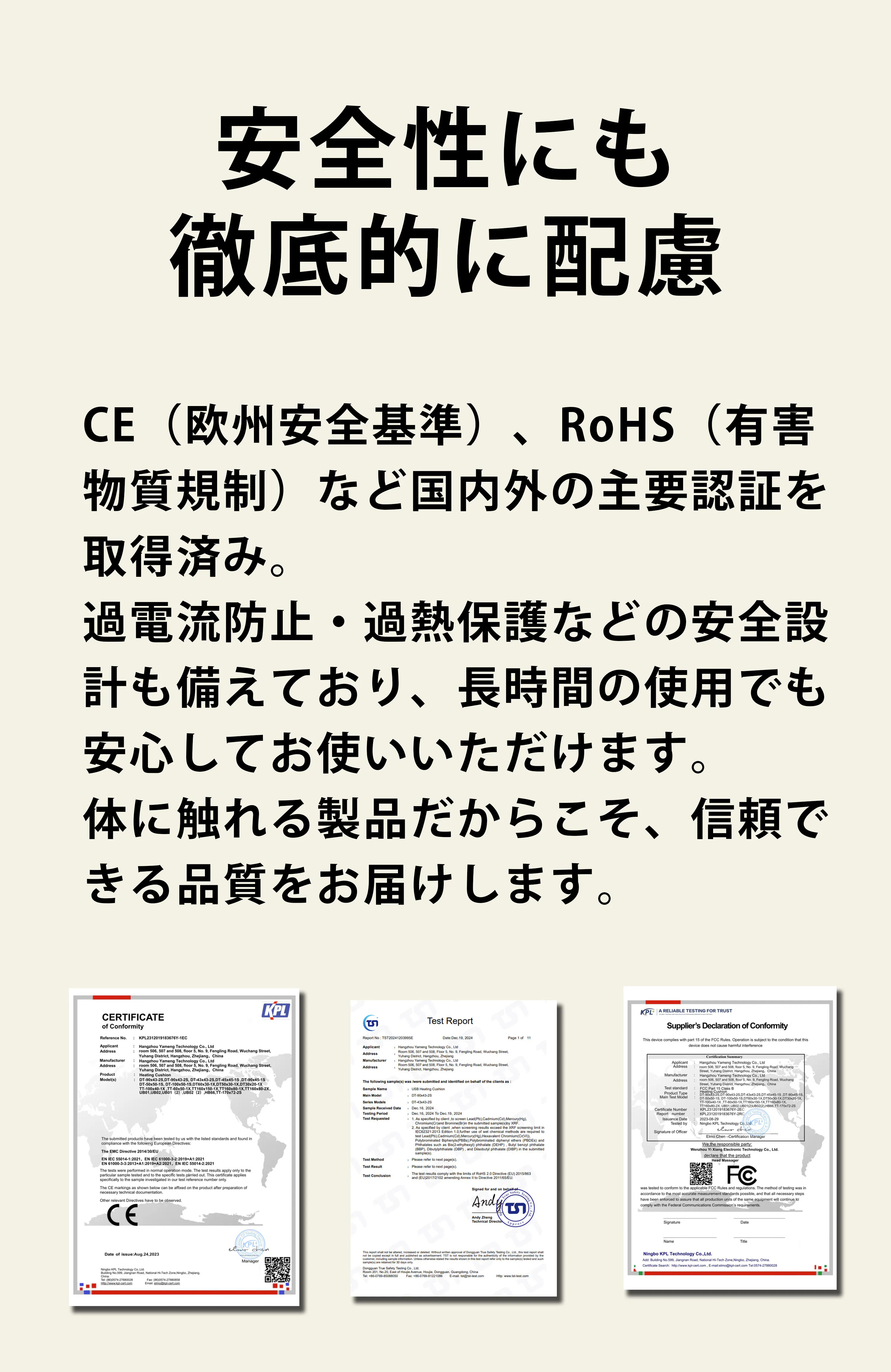 これらの基準を満たした設計により、長時間使用しても安心。直接肌に触れる製品だからこそ、安全と品質に一切の妥協をしていません。世界が認めた安心設計で、毎日のぬくもり時間をサポートします。