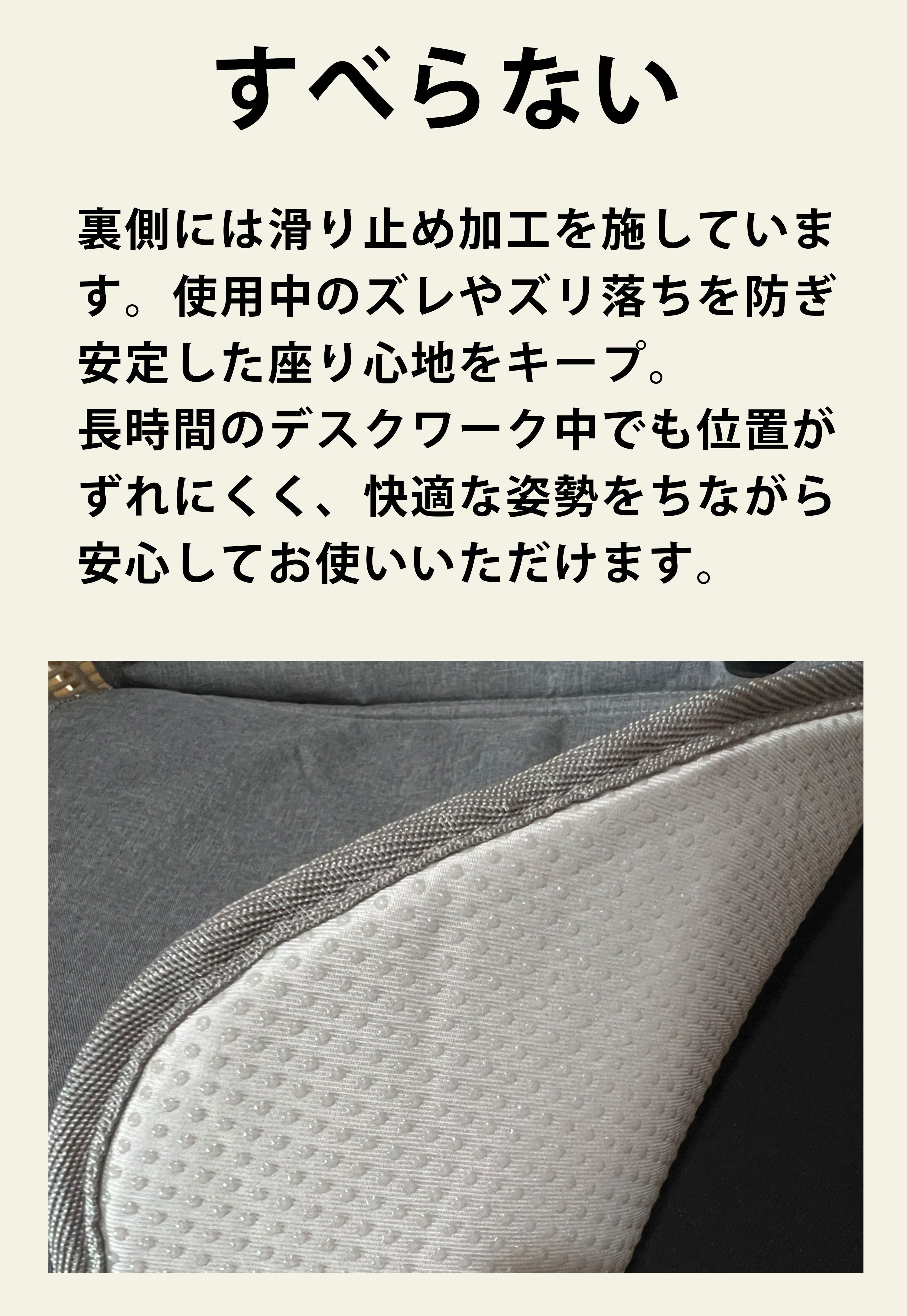 デスクワーク中に体を動かしても位置が変わらず、しっかりと背中とおしりを支える安定設計。