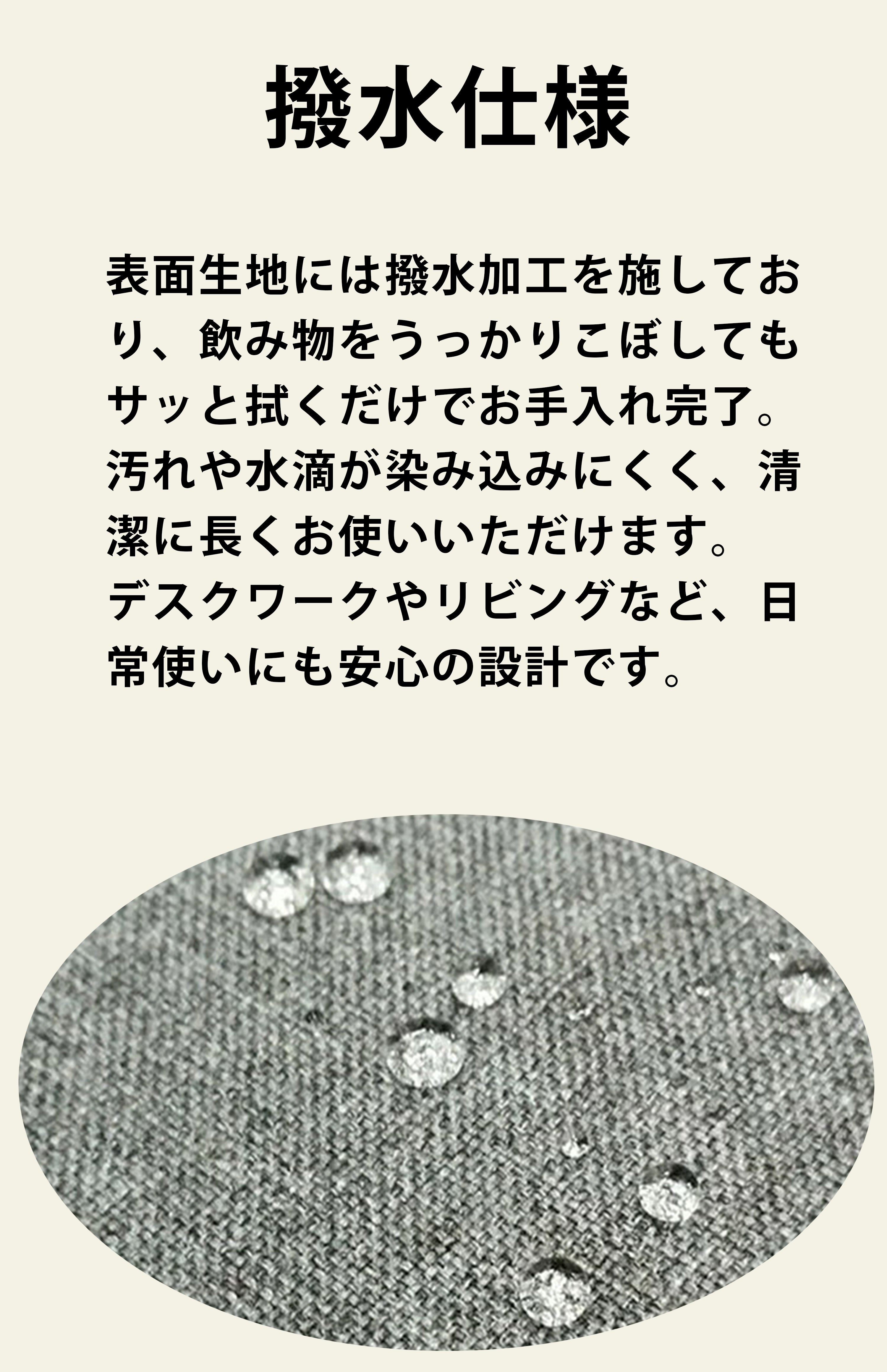 表面生地には撥水加工を施しており、コーヒーやお茶をこぼしても水滴を弾いてサッと拭くだけ。