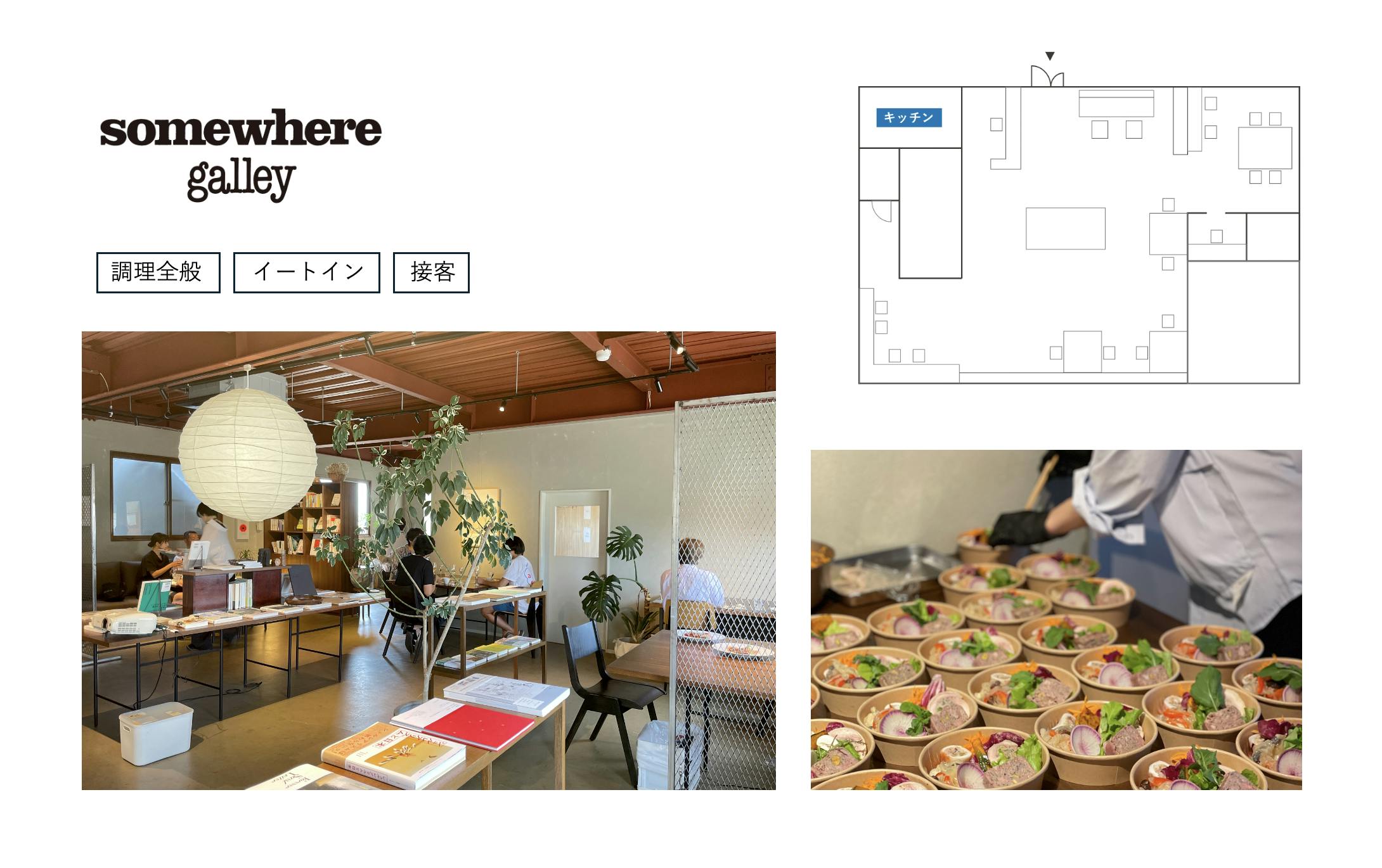 「galley」とは小さな調理室のこと。somewhere galleyでは、コンパクトな厨房ですが調理全般が可能です。〈そうざい製造/菓子製造許可あり〉somewhereの営業日以外の時間帯で利用でき、カフェの座席空間を使って間借り営業することもできます。またsomewhereでのPOPUPやコラボレーション等も展開でき、自分らしく〈表現〉することができます。