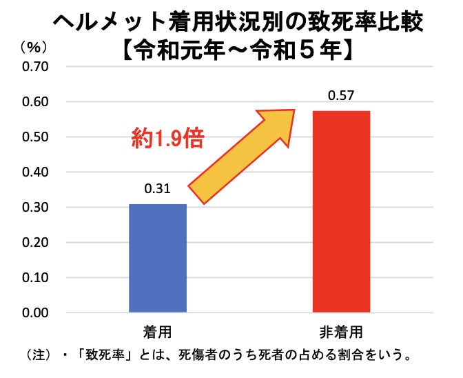 一時不停止、信号無視が事故原因の上位であり、ヘルメットを着用するだけで致死率が大幅に低下し、簡単に防ぐことができるのです。