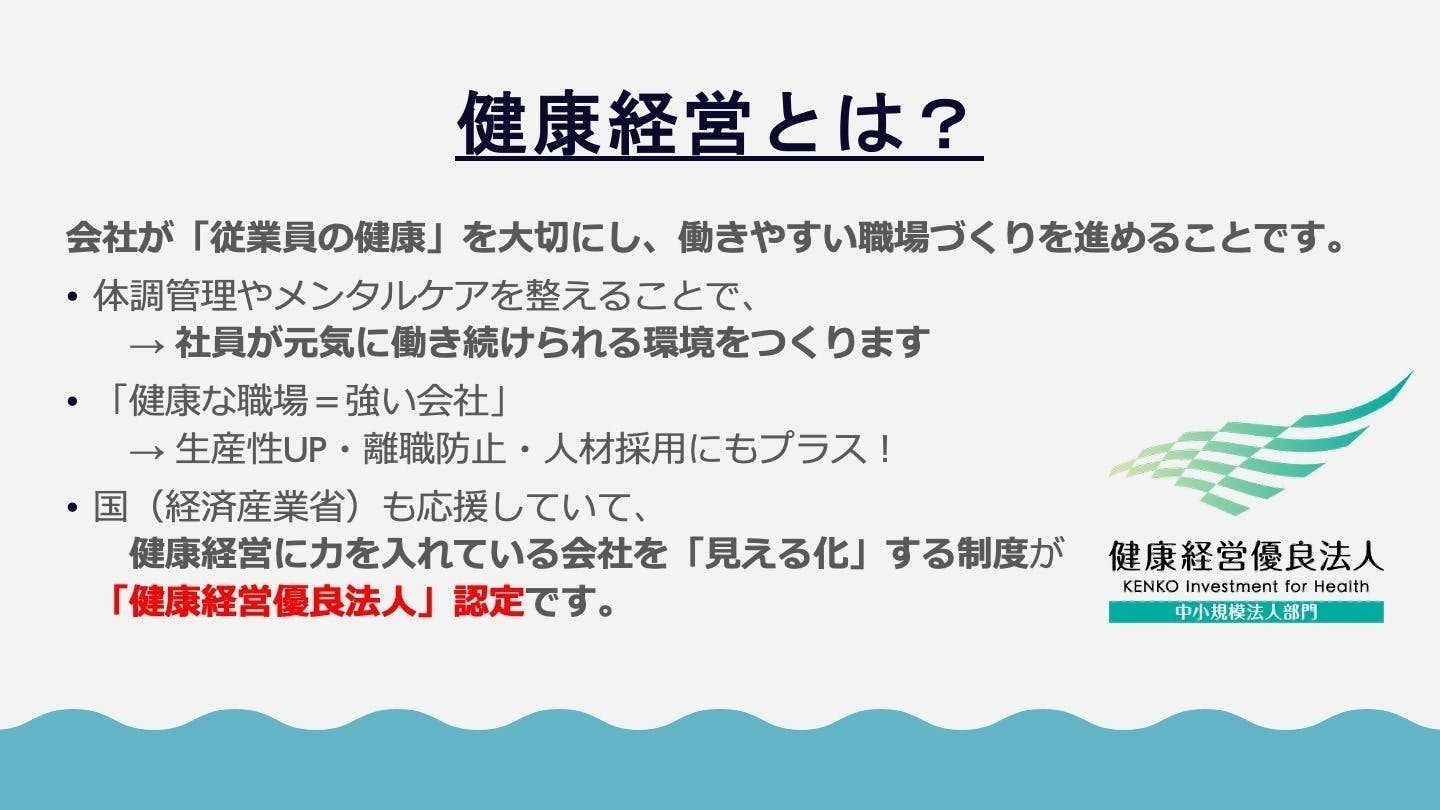 「健康経営」とは、会社が“従業員の健康”を大切にし、働きやすい職場づくりを経営戦略の一部として進める考え方です。