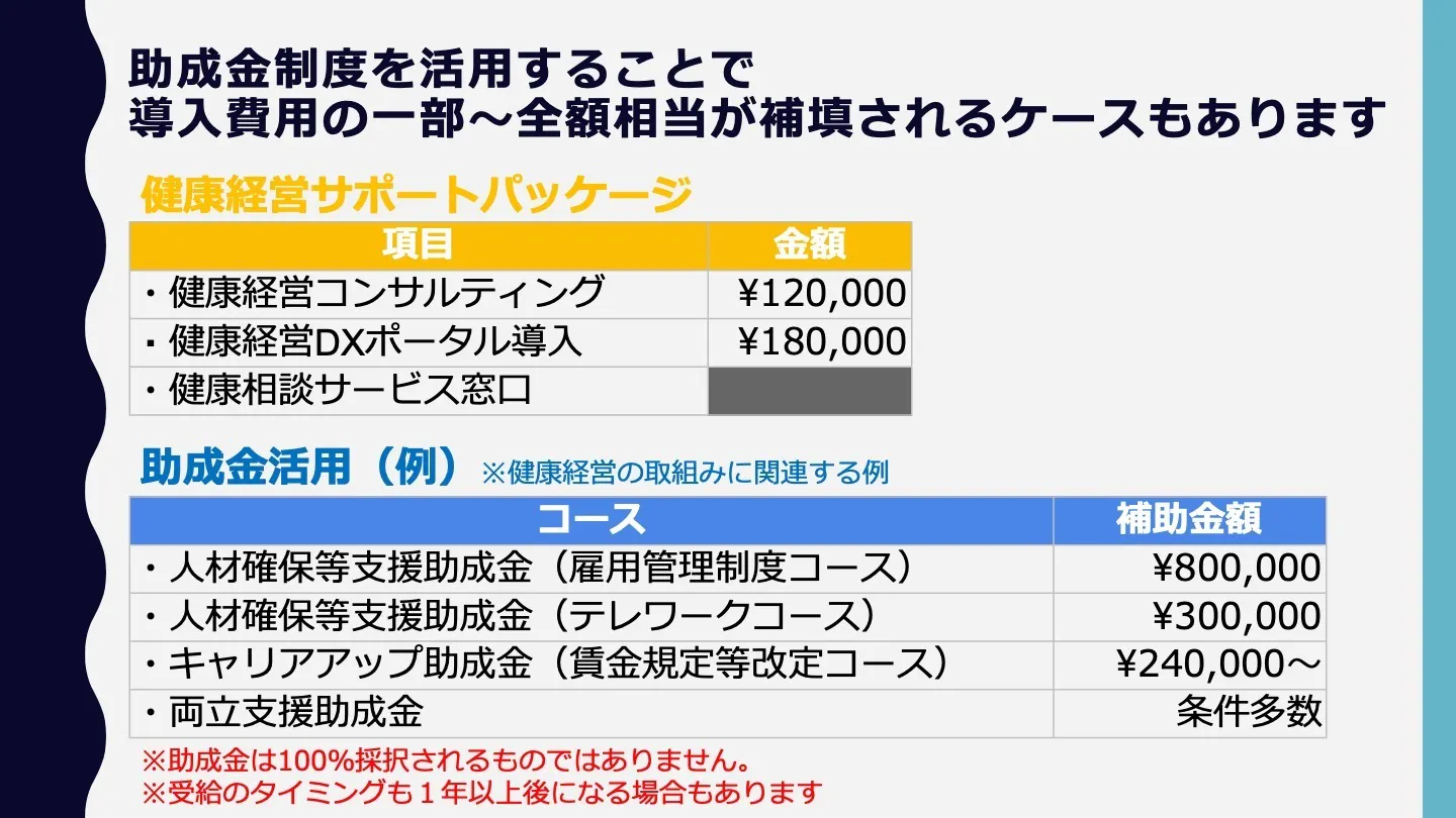 助成金申請から制度設計、研修、システム導入までを一体的にサポートすることで、コストを抑えながら実践的な健康経営の仕組みづくりを可能にしています。