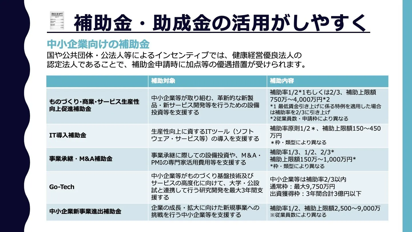 健康経営の取組みは、国の各種助成金制度と深く関係しており、導入費用の一部〜全額相当が補填されるケースもあります。
