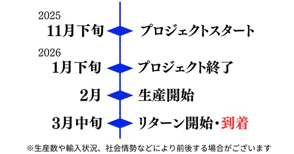 ※本文中に記載させていただいたスケジュールは、あくまでプロジェクト公開時点の予定です。支援購入の性質上、配送遅延のおそれがございます。