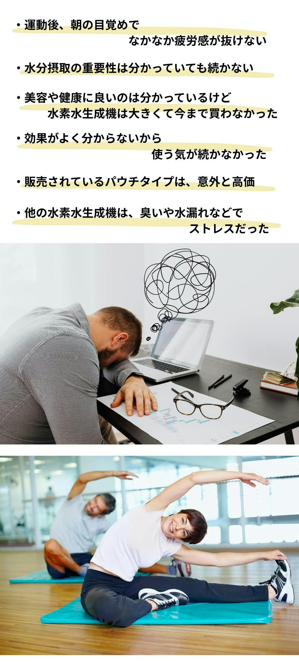 しかも、ただの水じゃない。たった3分でできたての高濃度水素水だから、飲む理由がちゃんとある。