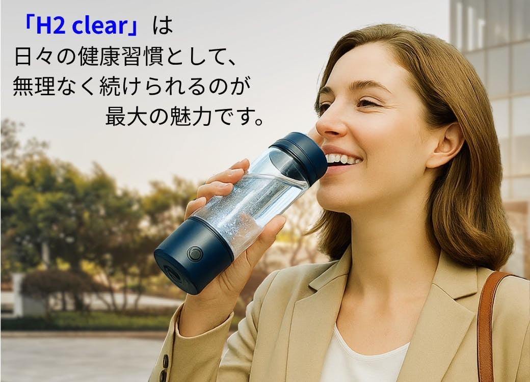 「H2 Clear」を販売した経緯につきましては、「忙しい毎日でも、無理なく健康を続けられる習慣を届けたい」という思いから、この水素水生成ボトルの企画をスタートしました。自分自身、仕事や年齢による体調変化を感じる中で、水分補給や疲労ケアの大切さを実感。ペットボトルのミネラルウォーターを飲んでいましたが、やはり習慣とするのは難しく、いつも忘れてしまいます。そこで着目したのが、“たった3分でできる高濃度水素水”。コンパクトで手軽、手軽に生成することで飲むのを習慣づけれる「H2 Clear」に出会いました。毎日の小さな一杯が、あなたの体と生活を変えるきっかけになりますように。