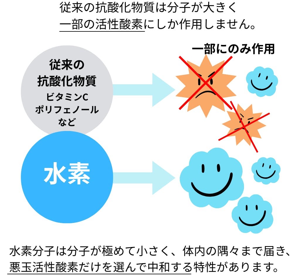 これを無害な水に変え、体外に排出する働きを持つのが、水素です。