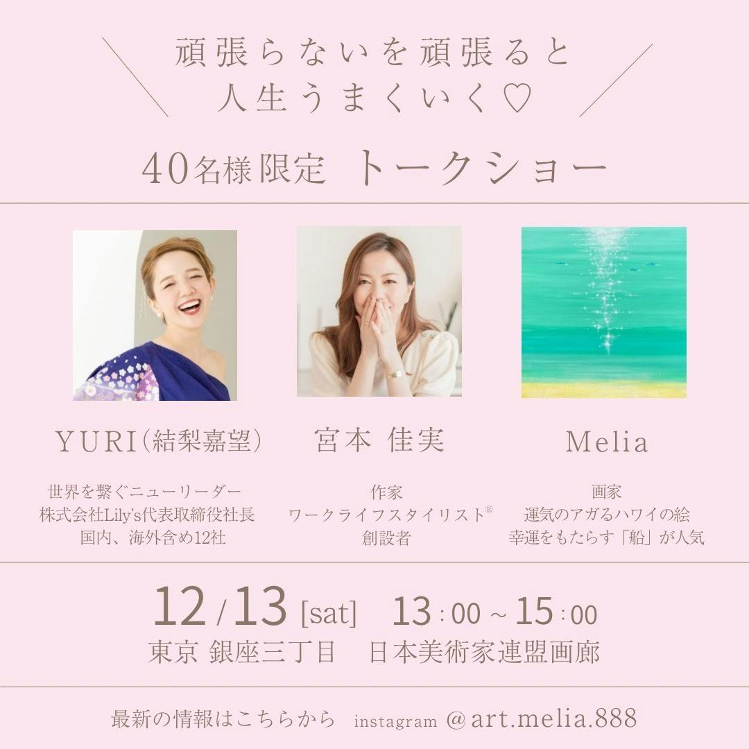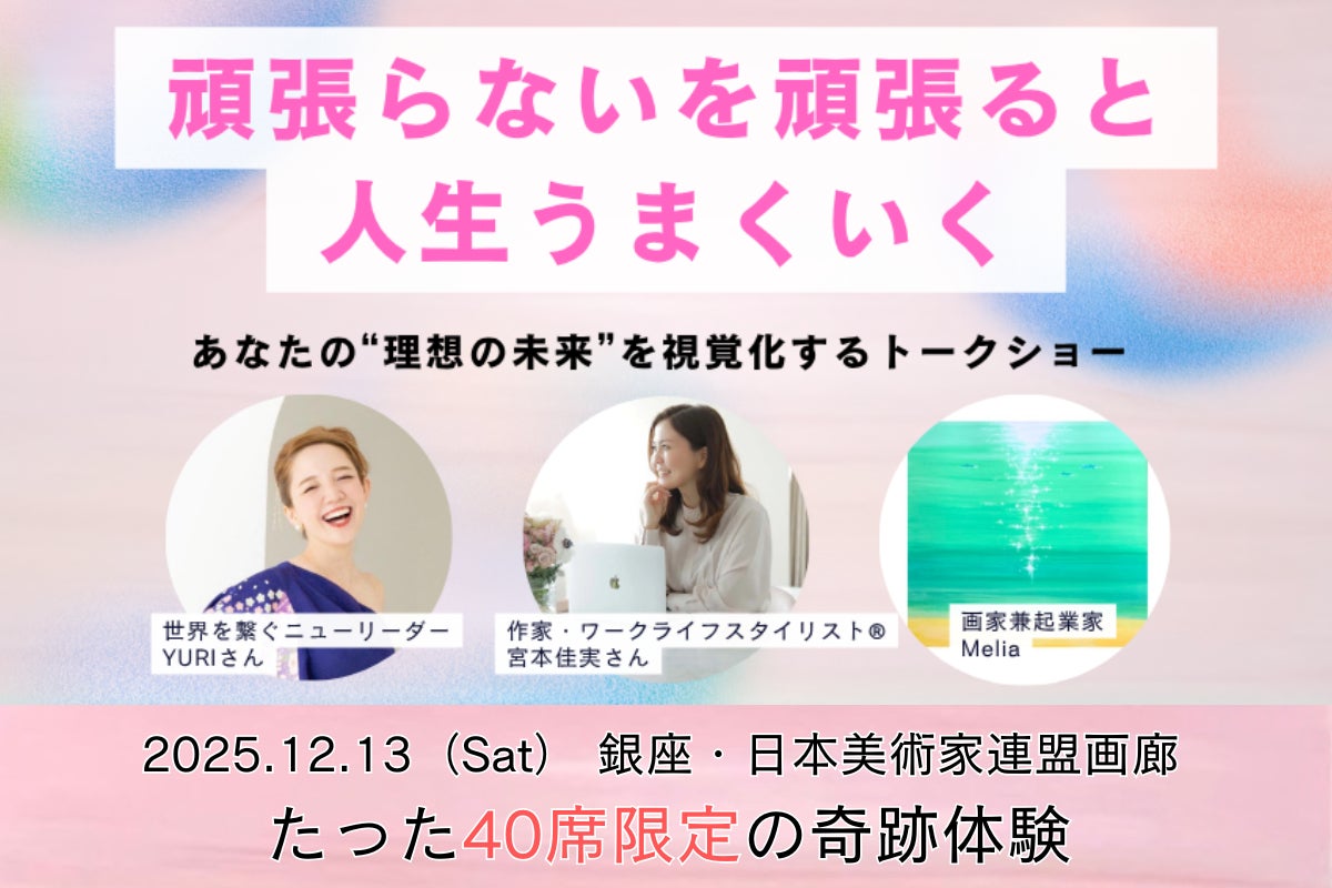 このイベントでは、3人の登壇者(宮本佳実さん、YURIさん、Melia)がそれぞれの人生で「頑張る」を手放した瞬間に起きた変化などを語ります。